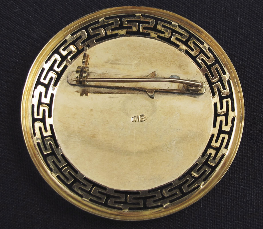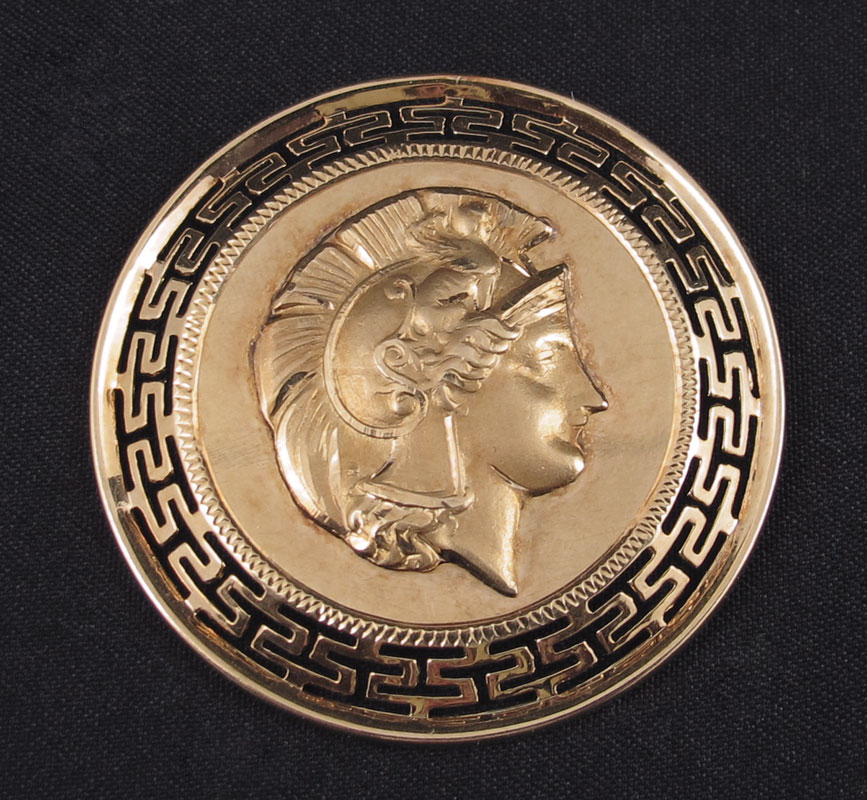 18K GRECIAN MEDALLION BROOCH: 18K yellow gold medallion with a Repouss‚ Grecian warrior on front. Greek Key cut out design on frame. Bar pin closure. Weight: 10.4 grams. 1 1/4'' in diameter.