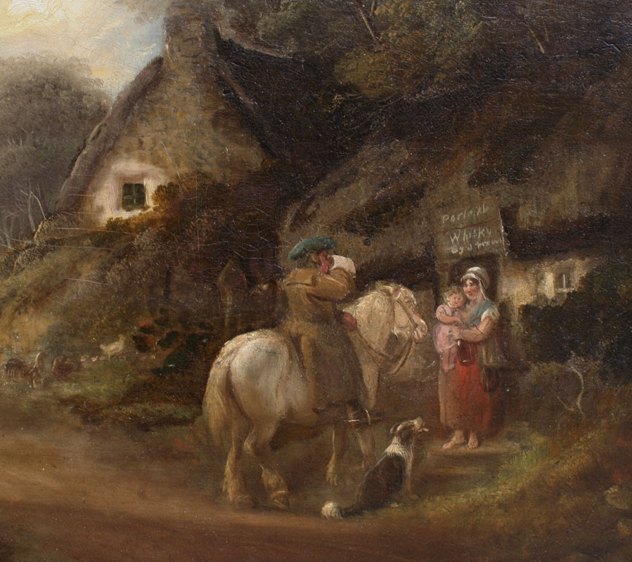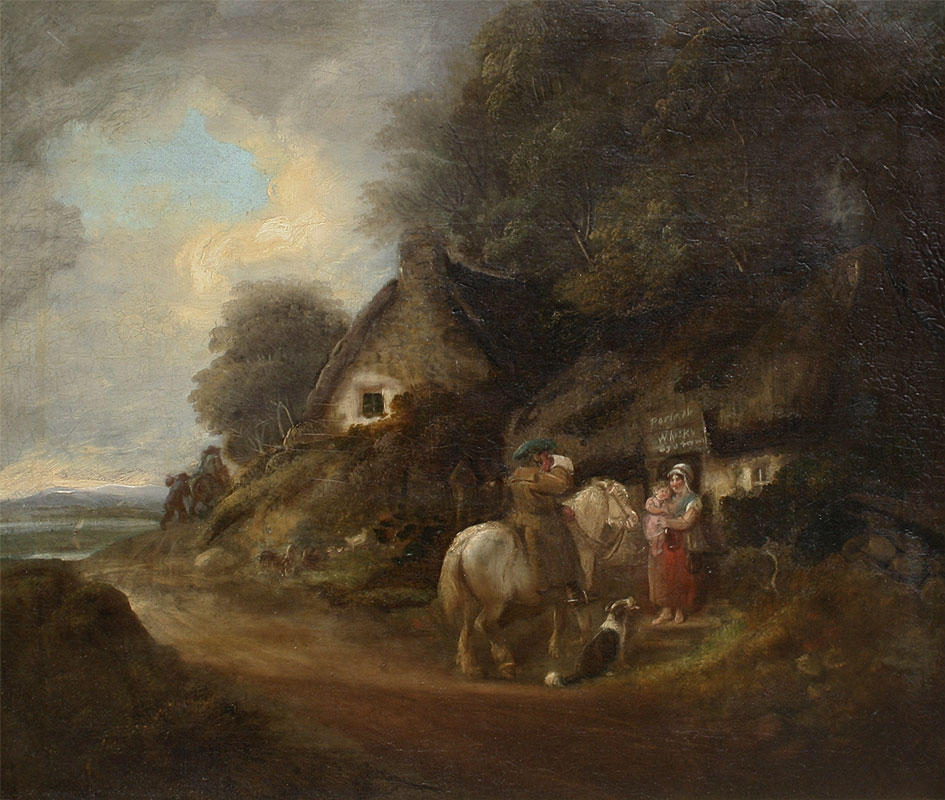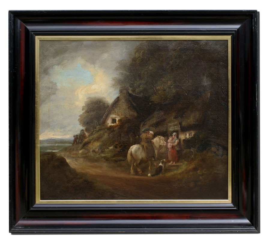English Landscape with Weary Traveler Returning Home, Sipping from a Jug of Whiskey, Oil/Canvas, 25'' x 30'', no visible signature, framed, 32 1/2'' x 38''.