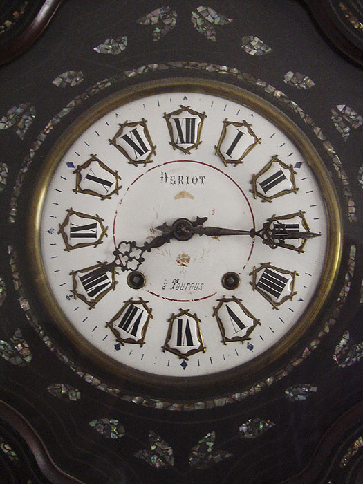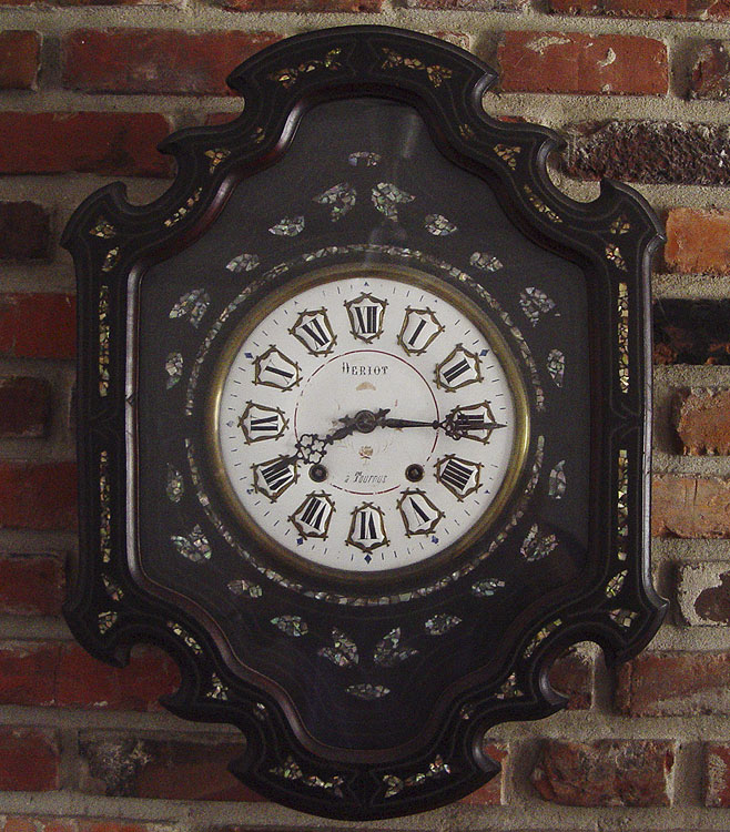 FRENCH MOTHER OF PEARL INLAID PICTURE FRAME CLOCK: Mother of pearl inlay interior and exterior frame, hand painted porcelain face marked Deriot a Tournes with Arabic numerals. Key and pendulum in office. 25'' h. x 19'' x 5 1/2''.