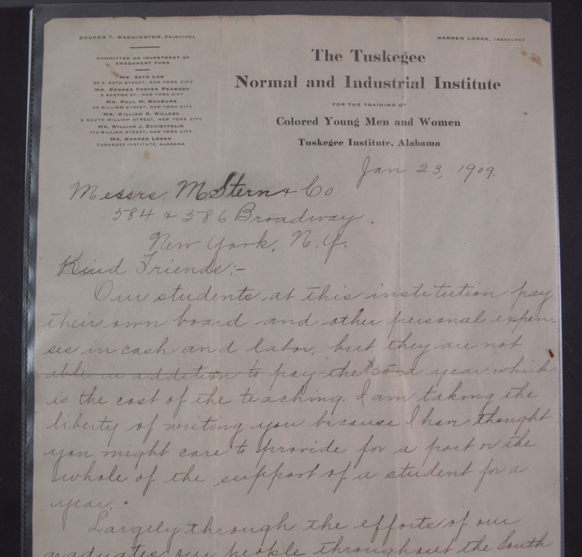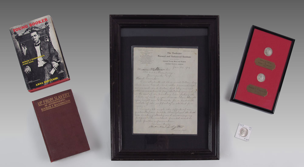 BOOKER T. WASHINGTON COLLECTION: Includes 1) Signed letter dated 1809, Letter appears to be secretarial written, then signed by Washington. Content of letter is an appeal to sponsor a student for $50 for a year of studies. On The Tuskegee Normal and Industrial Institute for the Training of Colored Young Men and Women letterhead. 2) 1901 edition Up From Slavery book, note spine and front cover has separated. 3) First Edition Young Booker book by Arna Bontemps. 4) 1951 Booker T. Washington half dollar and 1954 George Carver & Booker T Washington half dollar in a frame. 5) 1952 George Carver and Booker T Washington half dollar.