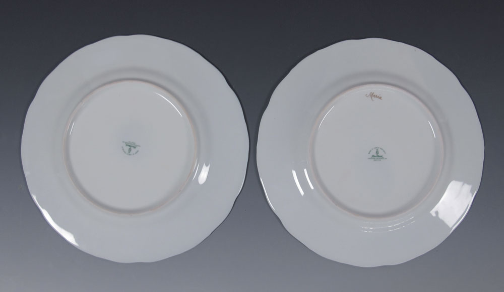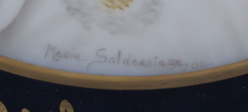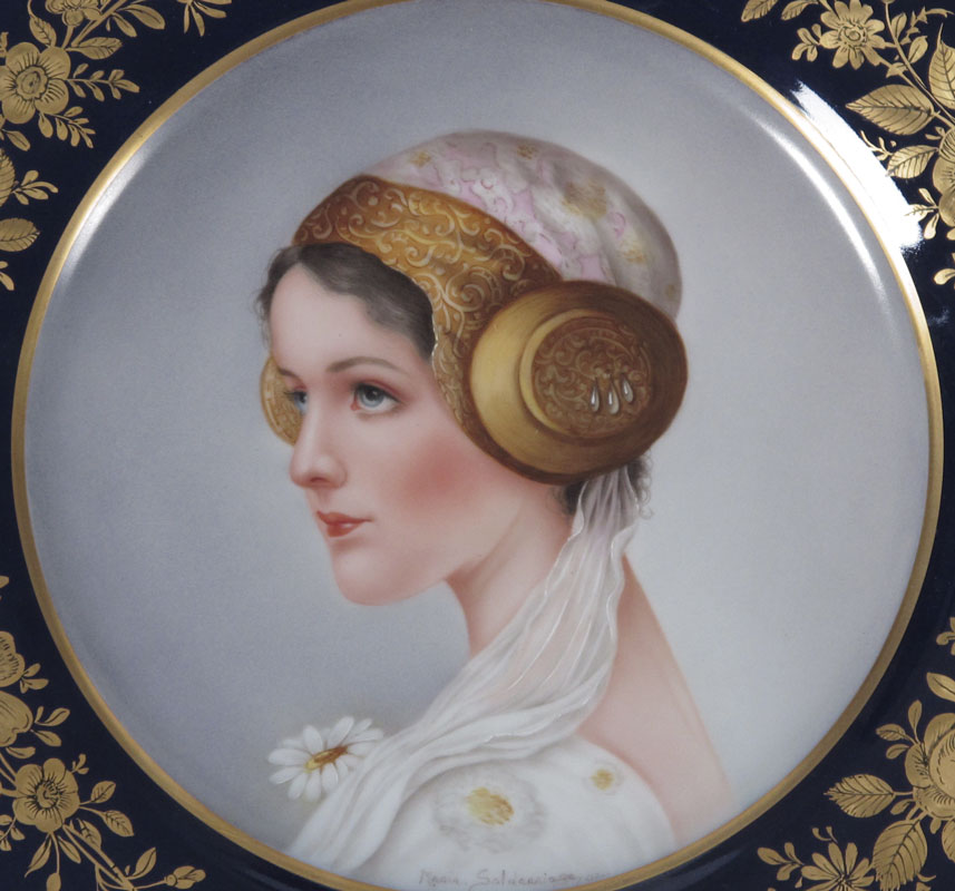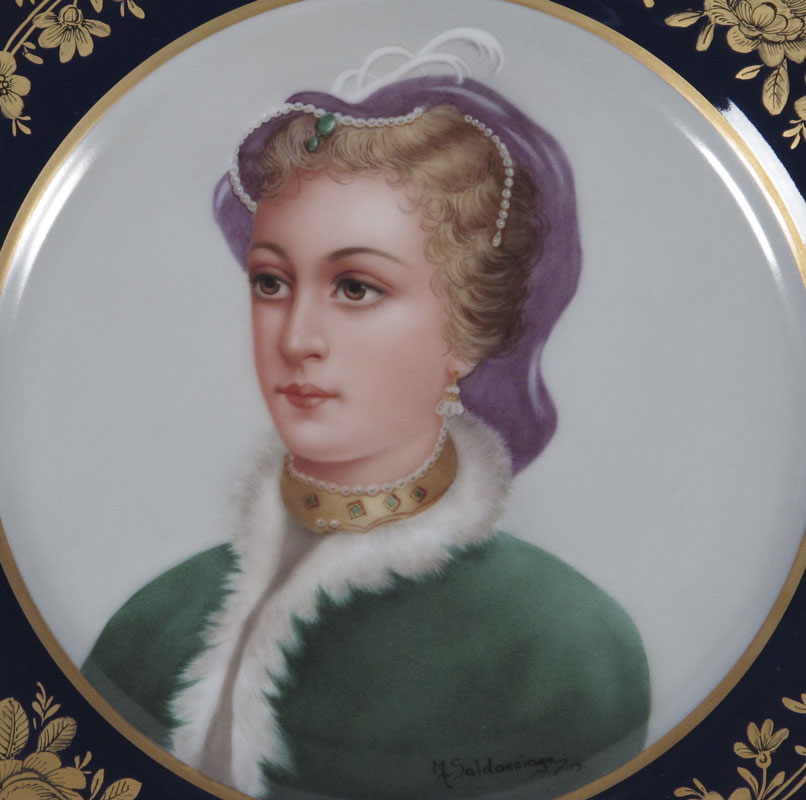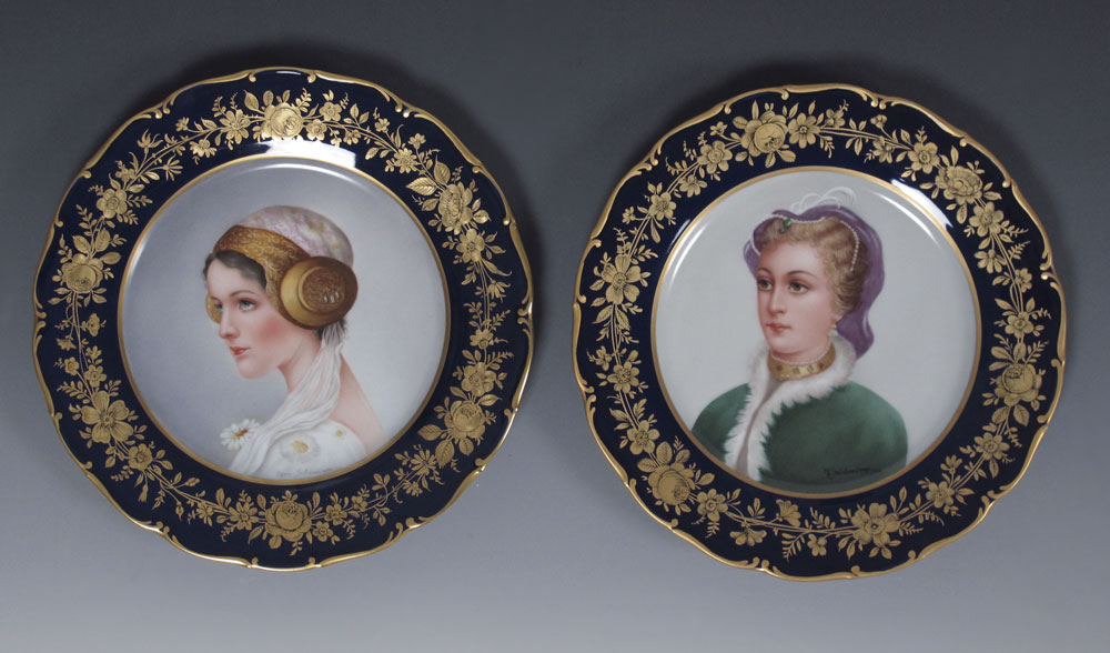 SALDARRIAGA, Maria, (American 20th C): Two painted porcelain portrait plates, gold on cobalt rims. Fine Czech porcelain, 10'' dia., signed.