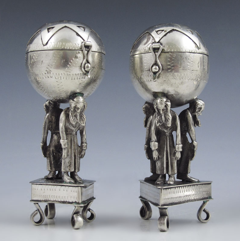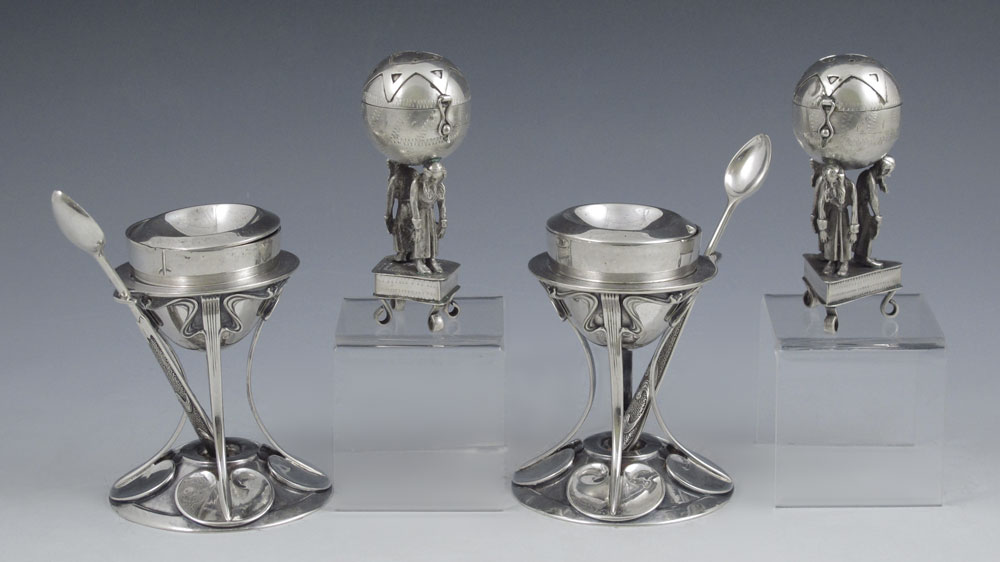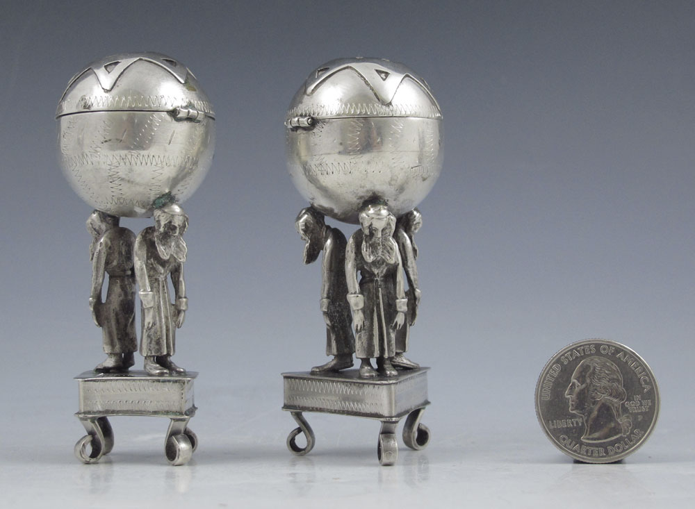 2 RUSSIAN JUDAICA FIGURAL SHAKERS: Pair salt & pepper shakers with figural rabbi's supporting globe tops with Star of David decoration. Unknown Cyrillic makers hallmark with Anatoly Artsibahov 1894 Moscow assay mark, 84 zolotnik. 3 1/4'' h. x 1 1/2''. Sold with pair of art deco silverplate egg cup and spoons, unmarked. 3 3/8'' x 2 3/4'' base dia. Shakers weigh approx. 3.7 troy oz.