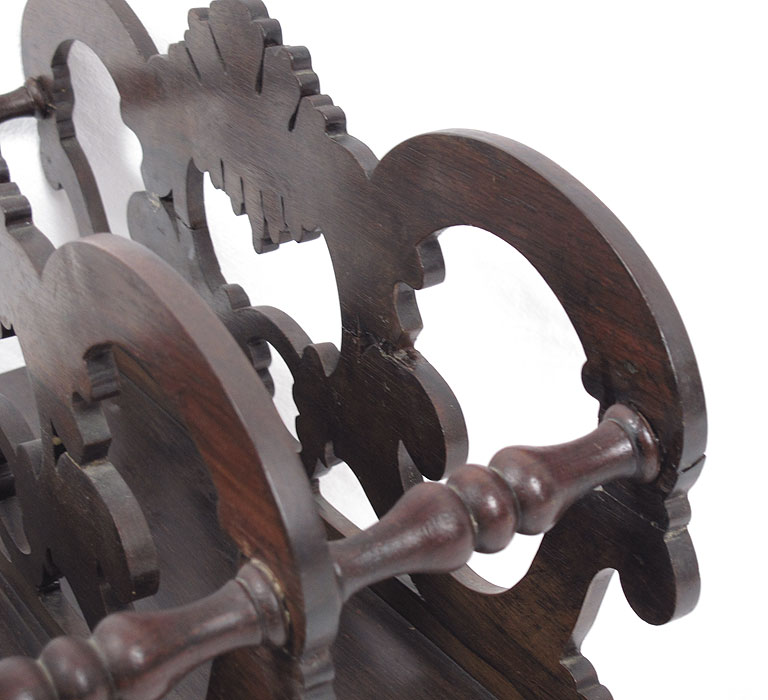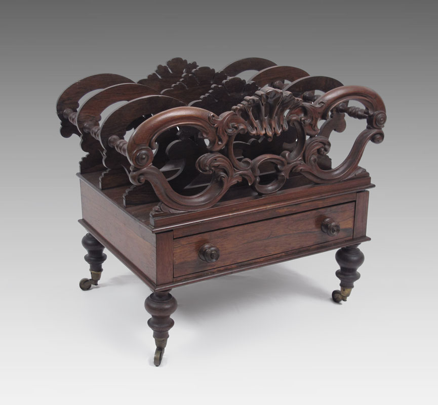 EARLY VICTORIAN CARVED ROSEWOOD CANTERBURY: Shaped, carved and pierced dividers over single drawer on ball turned legs on castors. 18 1/2'' x 20 1/2'' x 14 1/2''.