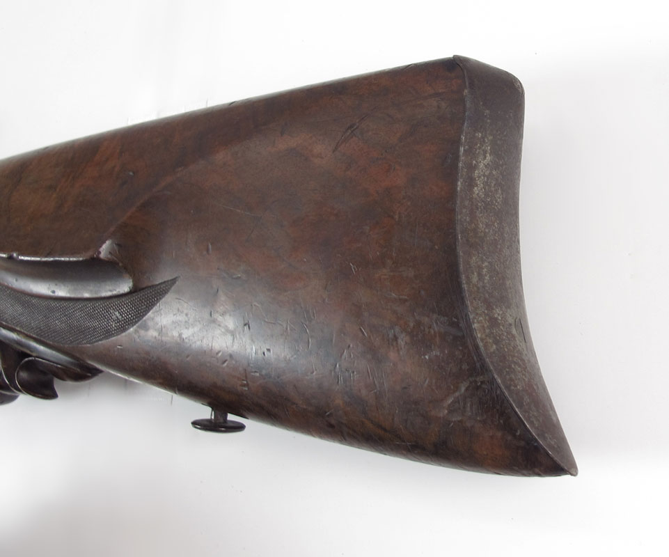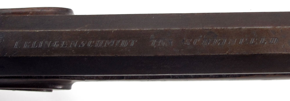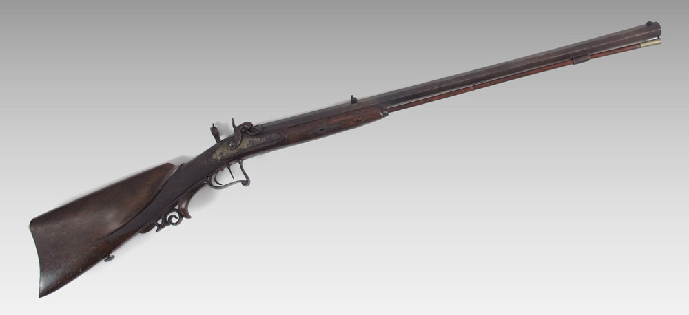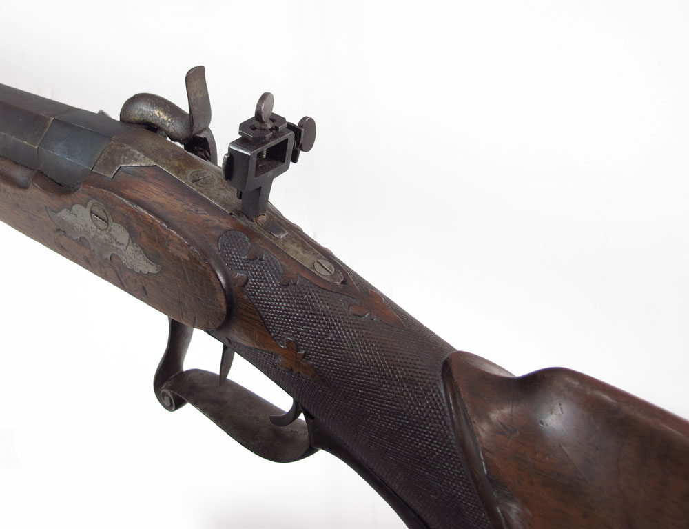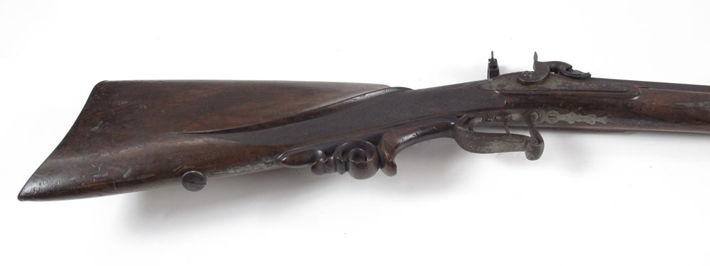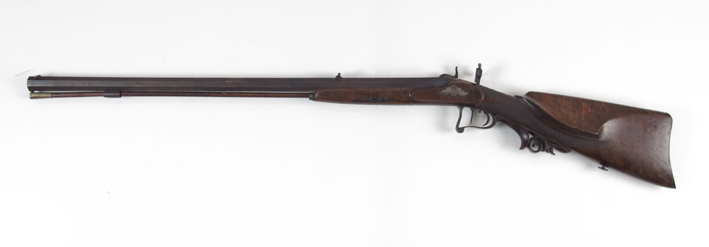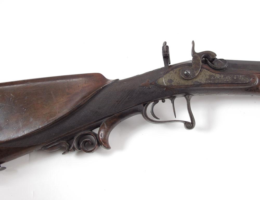 19TH CENTURY KLINGENSCHMIDT GERMAN CARVED SPORTING RIFLE: 29 1/2'' octagon barrel engraved I Klingenschmidt in Scheinfeld. Carved and shaped wood stock with scroll carved decoration off trigger guard. Lock plate unmarked. Action works. 46'' overall.