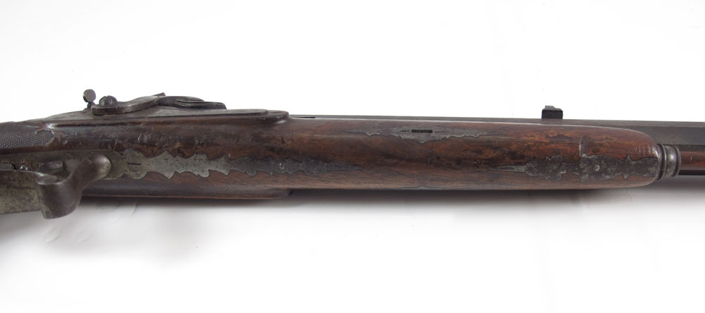 CONDITION: Dark age patina on barrel, age discoloration on lockplate, numerous nicks & scratches, missing front pin on stock, rod appears to be replacement.