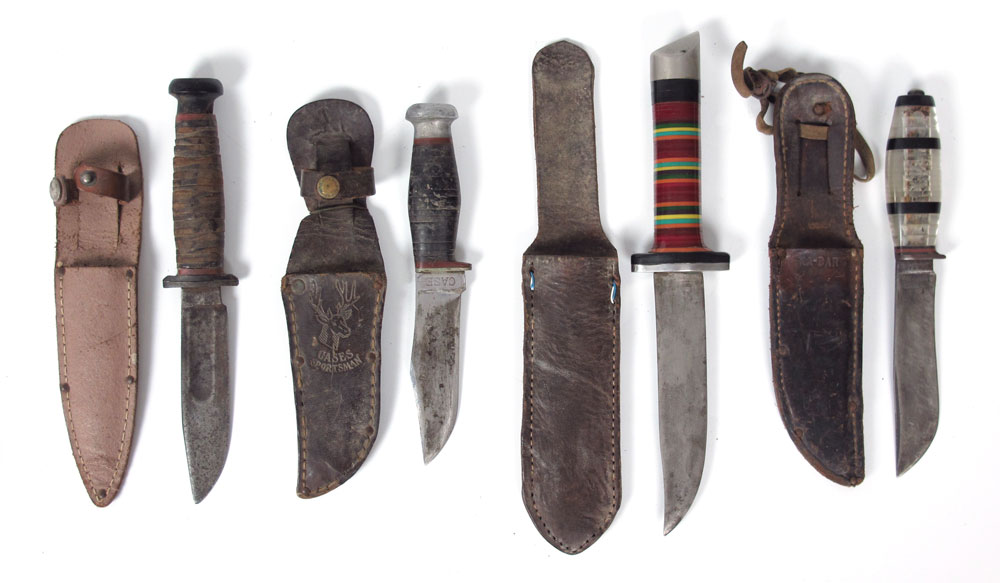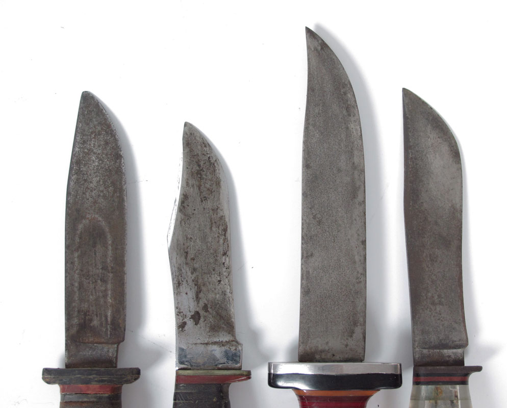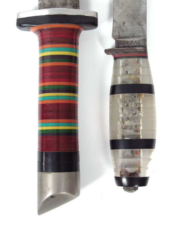 4 WWII ERA PACIFIC THEATER KNIVES: To include 1) Ka-Bar with theater altered custom clear and black plastic handle 5'' blade, 9'' overall, leather sheath. 2)Unknown maker with theater altered multi colored plastic handle. 6'' unmarked blade, 11 1/2'' overall, leather sheath. 3) Kinfolk with crude theater altered handle, 5'' blade, 9 3/4'' overall, leather sheath. 4) Case with unaltered handle, 4 1/2'' blade, 8 1/4'' overall, leather sheath.