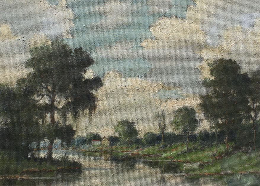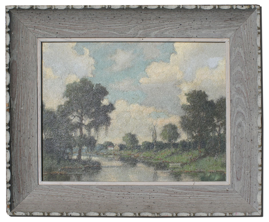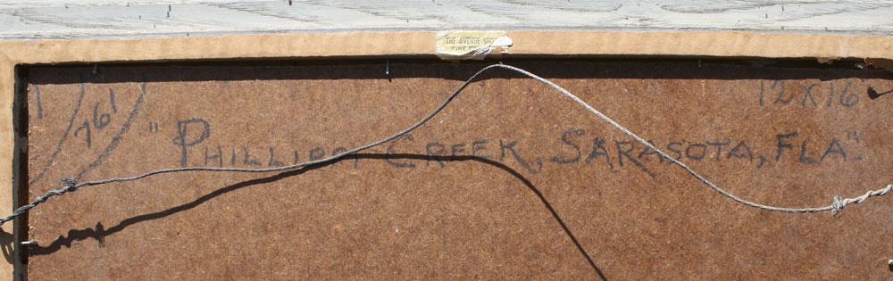 MOORE, Benson Bond, (American, 1882-1974): ''Phillippi Creek, Sarasota, FLA'', Oil/Masonite, 12'' x 16'', numbered 761, titled verso no visible signature, encased in original carved barn wood style frame with wear, 17'' x 21''.