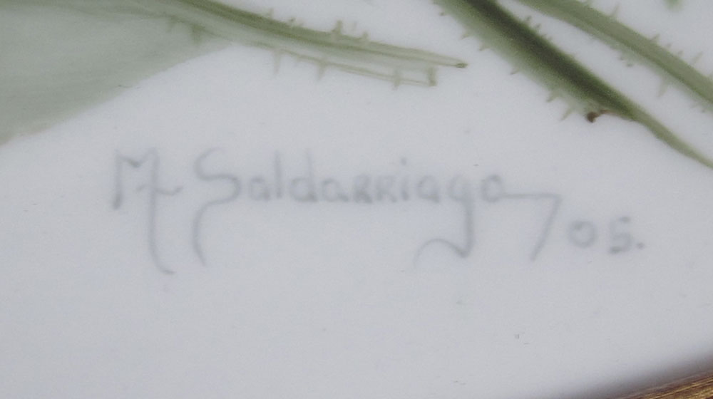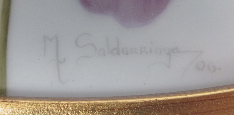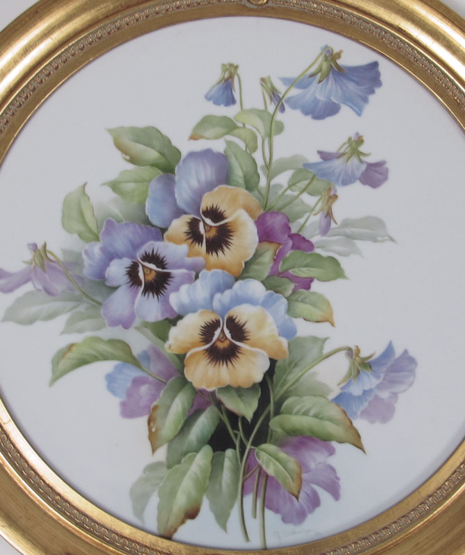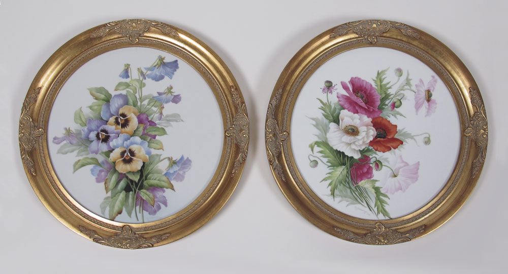 SALDARRIAGA, Maria, (American 20th C): Two framed painted porcelain round tiles, painting of violets and painting depicting poppies. Gilt woood frames, 17 1/4'' dia. overall.