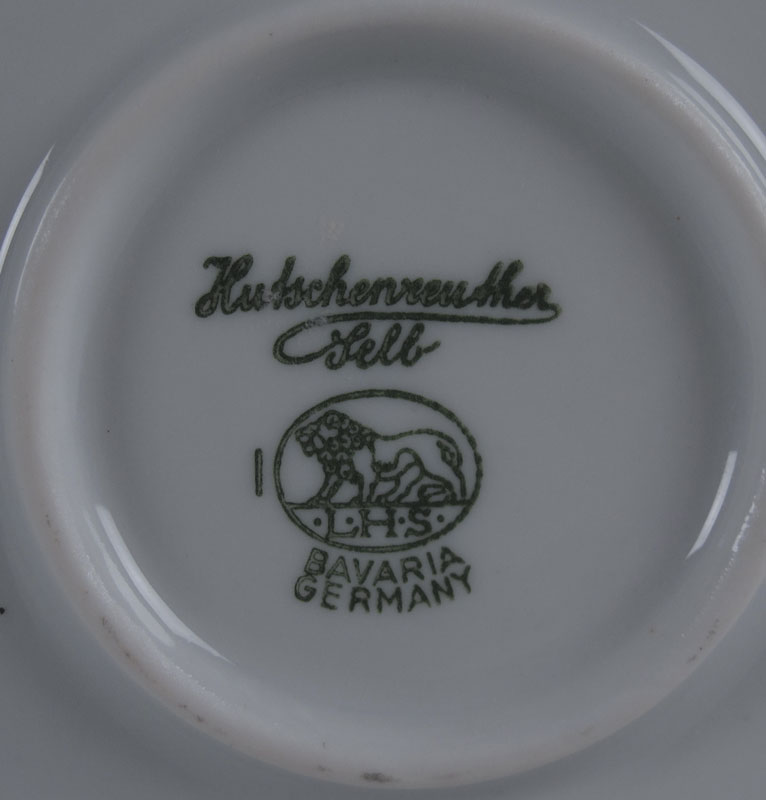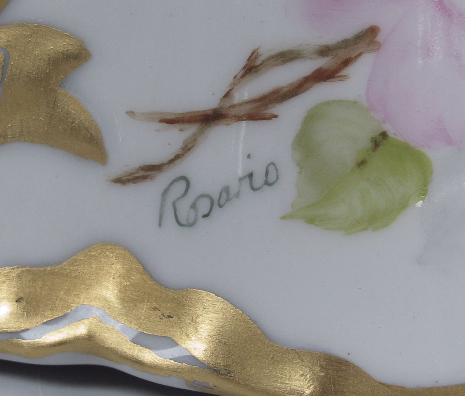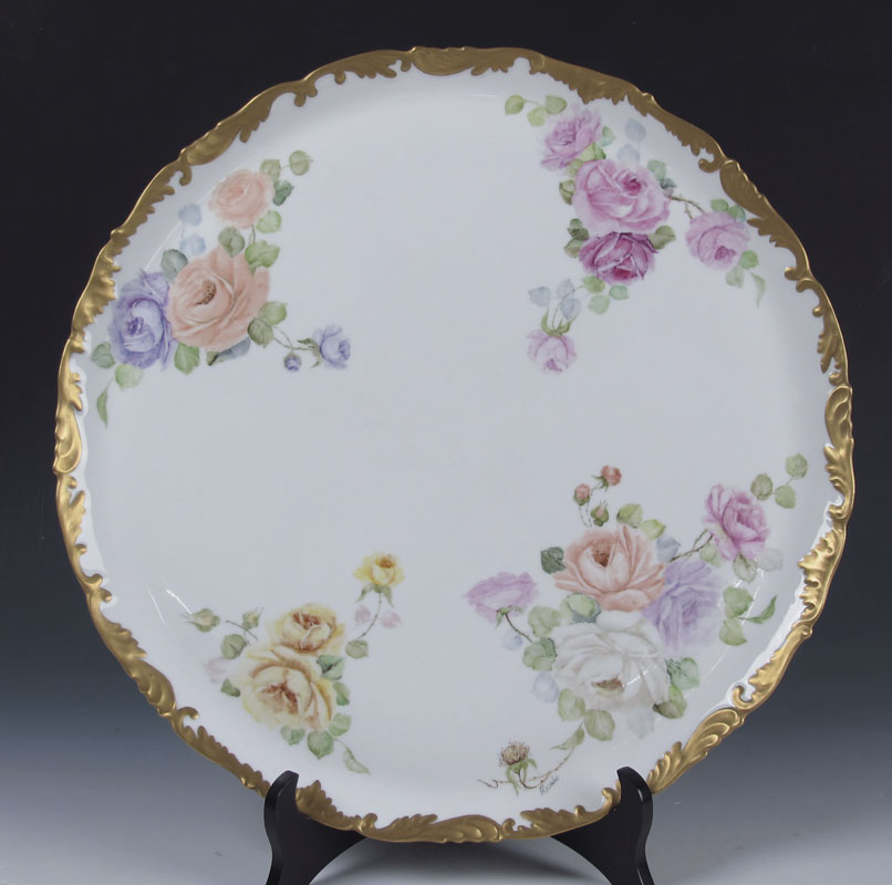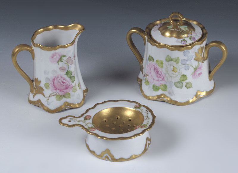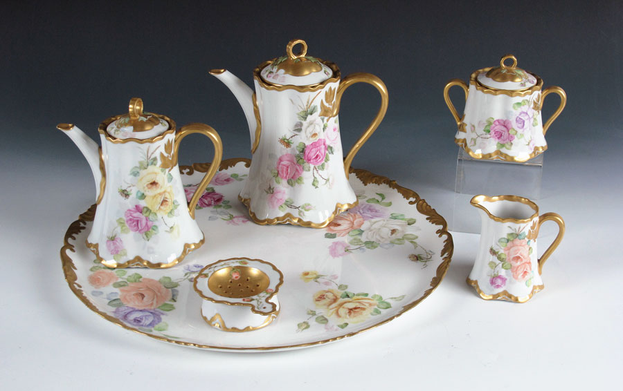 HAND PAINTED PORCELAIN TEA AND COFFEE SET: Rose decorated Limoges tray, 18'' dia. The Hutschenreuter coffee pot (9''), teapot, cream pitcher, sugar and strainer are all painted in the same rose pattern. All pieces are artist signed Rosario.