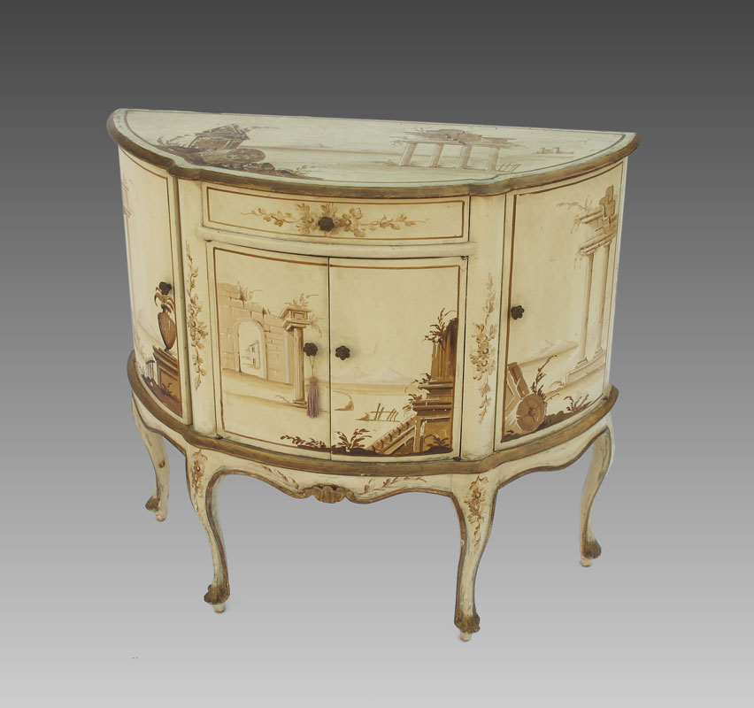 PAINT DECORATED DEMI CHEST: Decorated with hand painted scenes of ancient Greece. Single drawer over 4 doors with shaped legs and carved shell feet. 33 1/4'' h. x 35'' x 14''