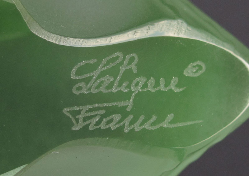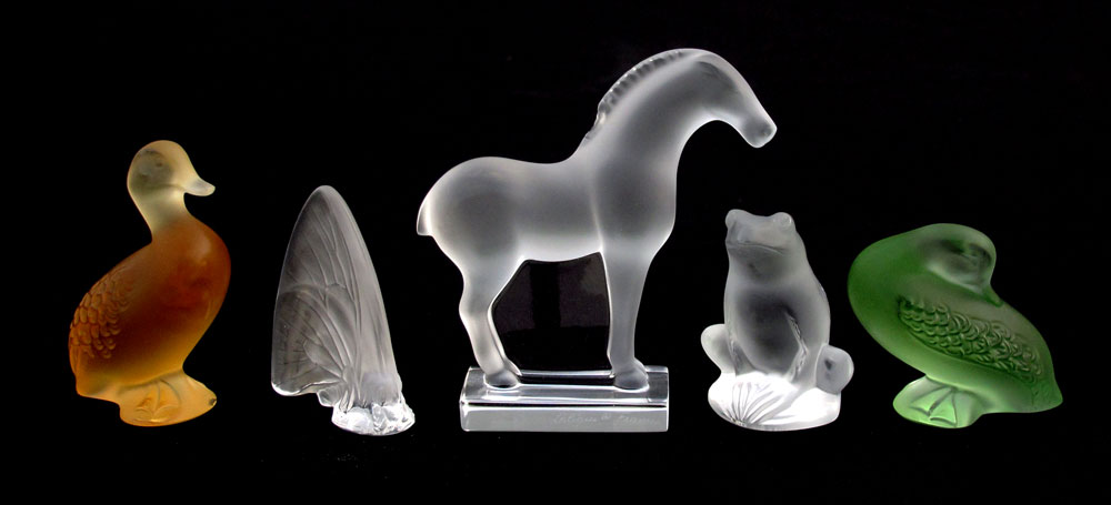 5 LALIQUE FRENCH CRYSTAL ANIMAL FIGURES: To include 1) Horse, 3 5/8'' x 3 1/2''. 2) Amber duck 2 3/4'' h. x 2''. 3) Green duck, 2 1/8'' x 2 1/4''. 4) Frog, 2'' h. x 1 1/4''. 5) Butterfly, 2 1/4'' x 1 7/8''.