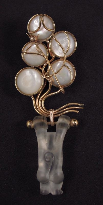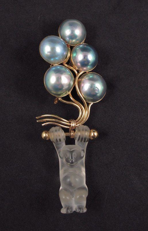 18K MABE PEARL & CRYSTAL MONKEY BROOCH/PENDANT: 18K yellow gold brooch depicts a monkey and balloons. Five 14.00 mm mabe pearls are blue/silver in color. High Luster. Carved monkey of rock crystal quartz pivots on a baton. The pearls are bezel set. Bar pin closure. Wire bail. Approx. 4'' in length. Mounting Weight: 12.0 grams Approx
