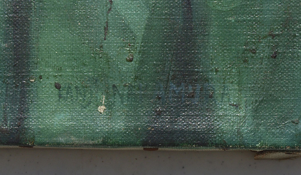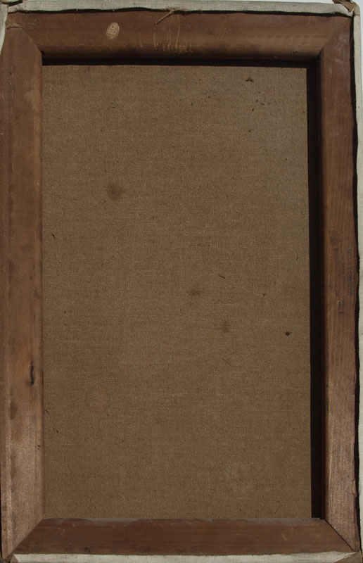 CONDITION: Several scattered abrasions, depression in the right shoulder of the sitter, minor stretcher bar wear.