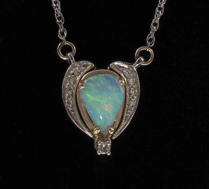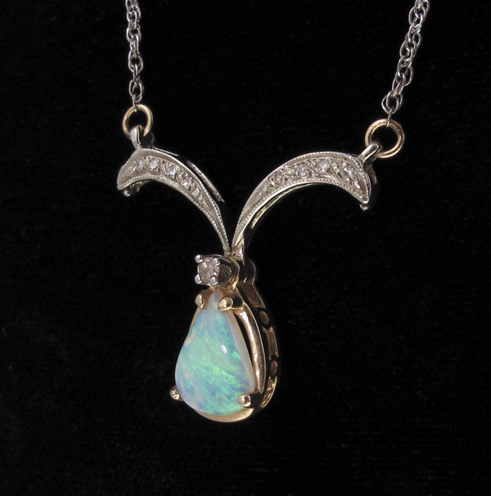 14K OPAL & DIAMOND METAMORPHIC NECKLACE: 14K yellow and white gold necklace contains nine round single cut diamonds. Weight: .05 Ct. Approx. The diamonds average VS-SI in clarity and H-I in color. 9.00 x 7.00 mm pear shaped cabochon cut opal. Weight: 1.00 Ct. Approx. Blue-green play-of-color. Bright. The diamonds and opals are prong set. 18''l., spring ring missing for clasp. Weight: 4.2 grams.
