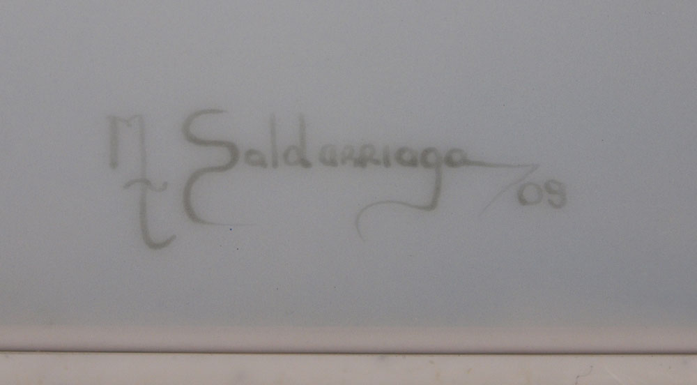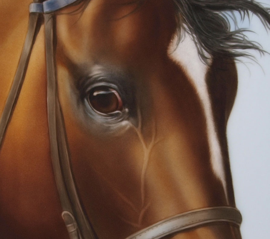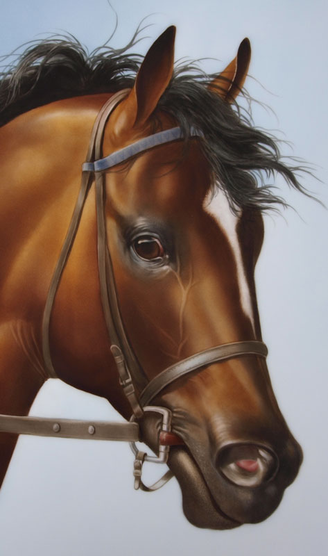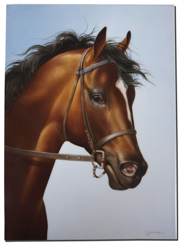 SALDARRIAGA, Maria, (American 20th C): Chestnut Thoroughbred, Painting on Porcelain, 16'' x 12'', signed lower right, dated '09, unframed. Impressed with mark in porcelain verso with Crown and D.
