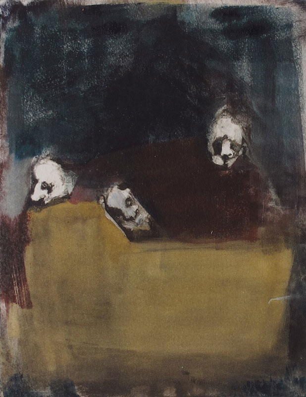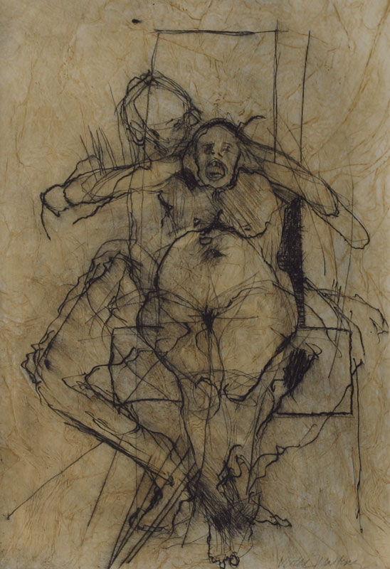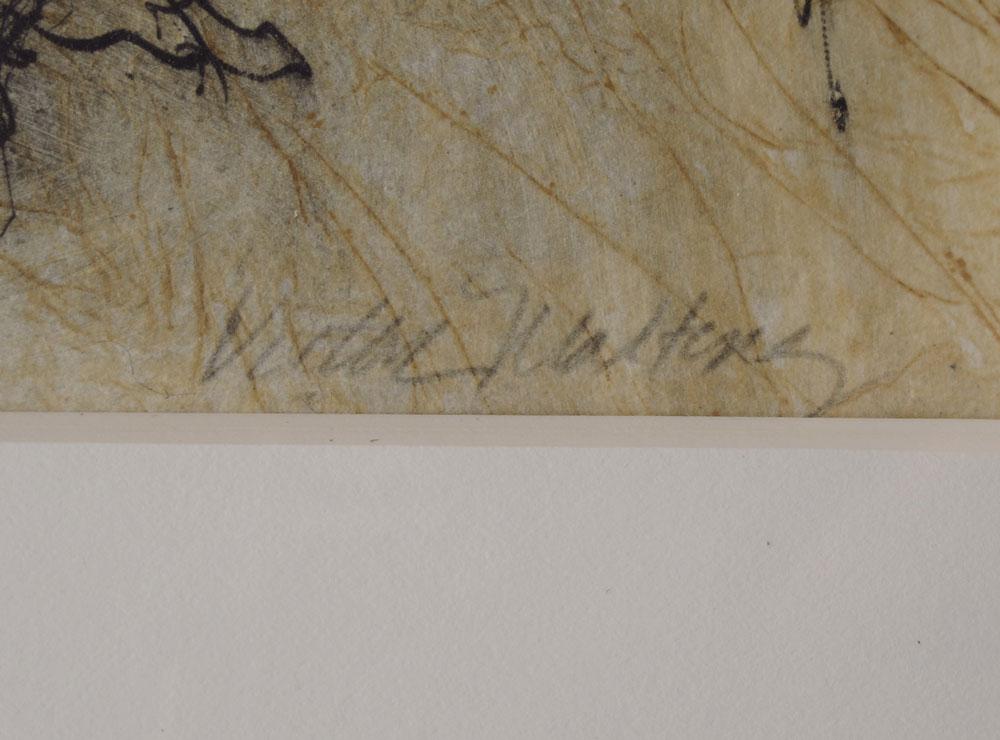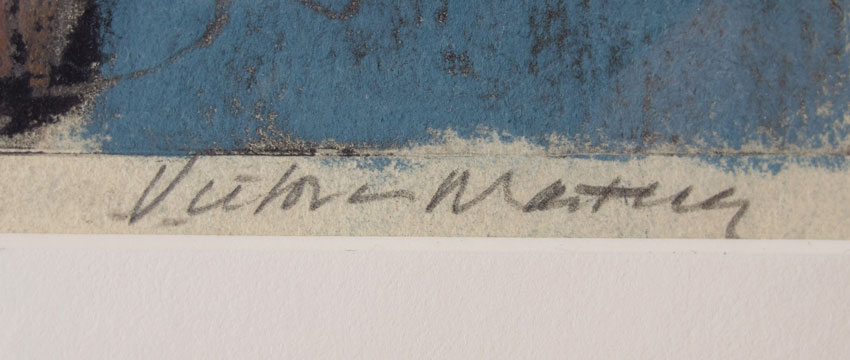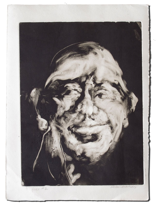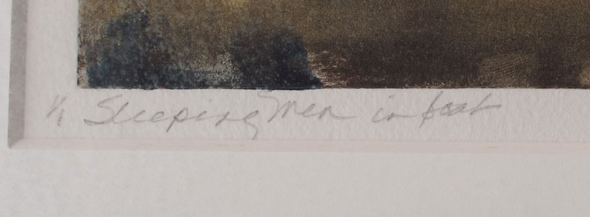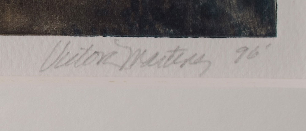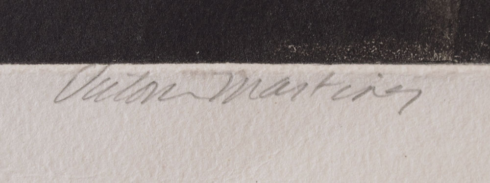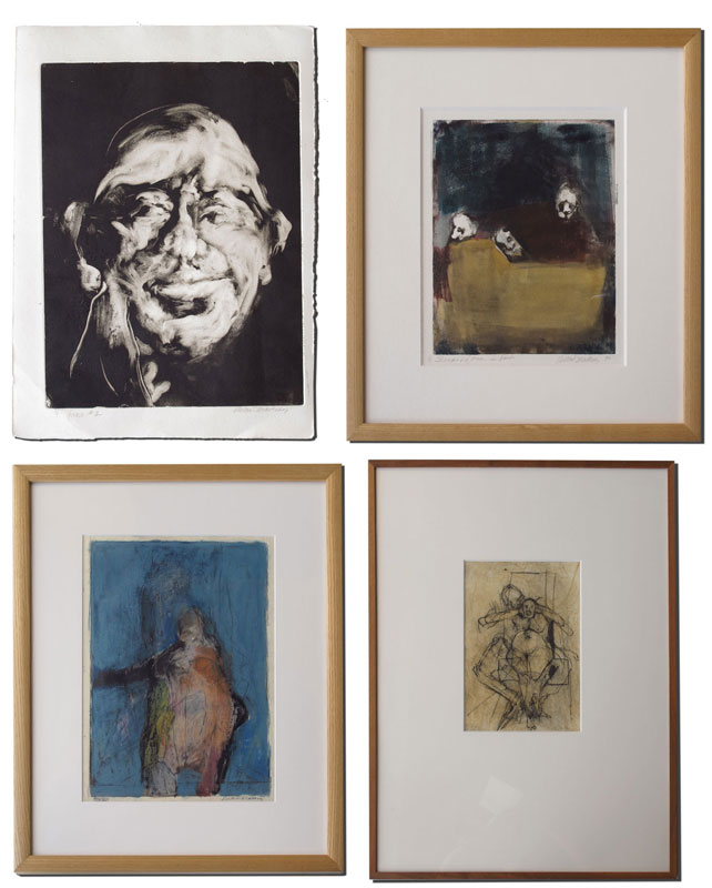 MARTINEZ, Victoria, (American, 20th, C.): 4 PIECE ART LOT TO INCLUDE: 1) Untitled Abstract with 2 Figures, Ink on Paper, 12'' x 9'', pencil signed lower right, custom frame, 30'' x 22''; 2) ''Torso In Blue'', Etching with Pastel, sight size 13 1/4'' x 9 3/4'', pencil signed lower right, titled foreso lower left, framed, 20 1/2'' x 17''; 3) ''Sleeping Men In Boat'', Etching with pastel, sight size 11 1/2'' x 9 1/2'', pencil signed lower right, dated '96, titled lower left, framed, 19 1/4'' x 17''; 4) ''Face #2'', mixed media print, 14 7/8'' x 11'', signed lower right, titled lower left and numbered 1/1, unframed, several minor creases.