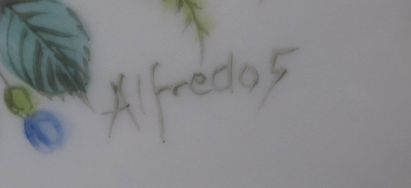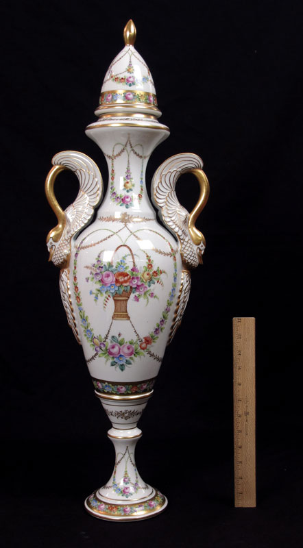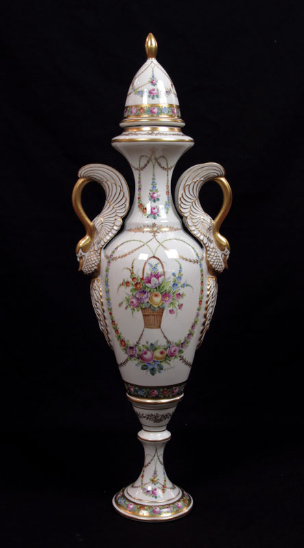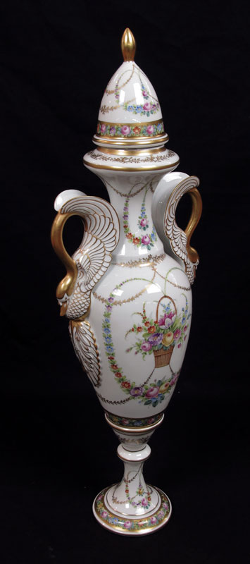 STUDIO PAINTED FRENCH LIMOGES PORCELAIN URN: Artist signed ''Alfredo'', Alfredo Toledano Escudero, painted in a flower basket and garland design with gilt embellishment. Swan form handles. 30'' tall, 10'' at the widest.