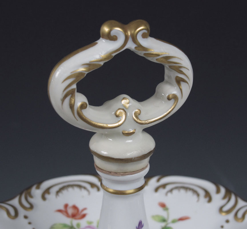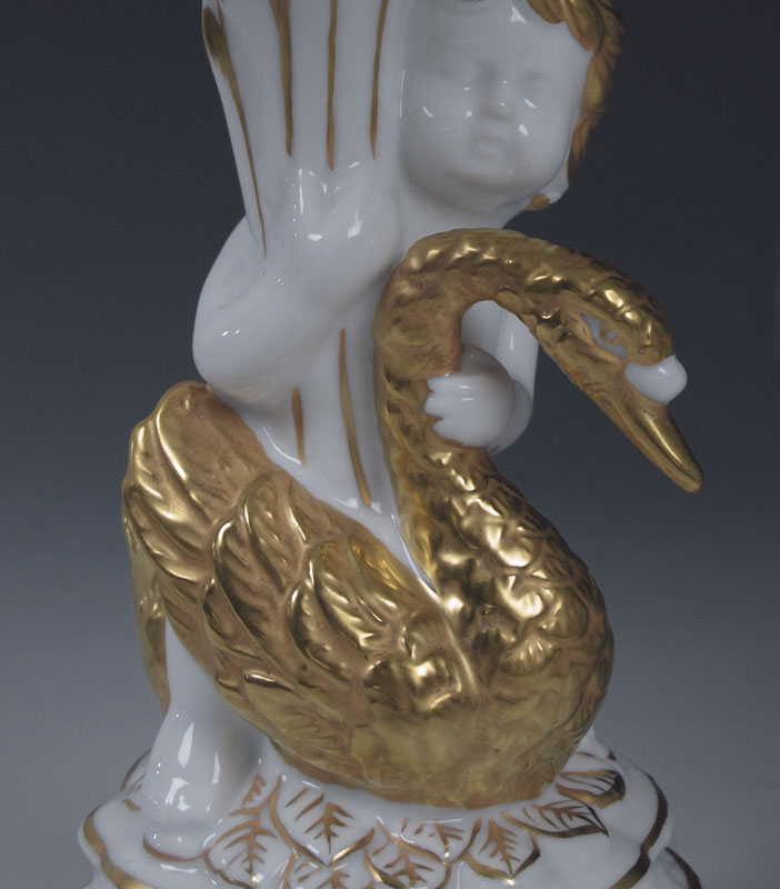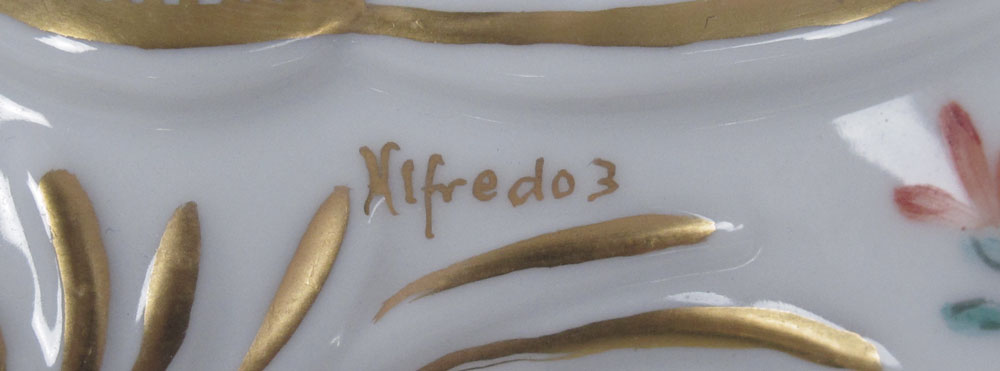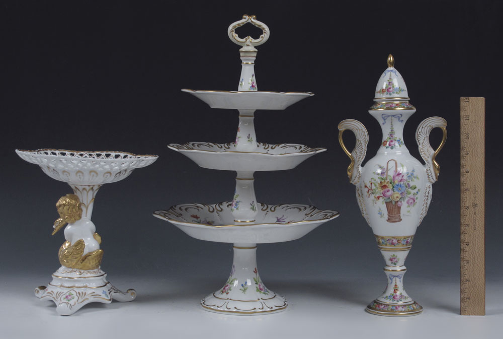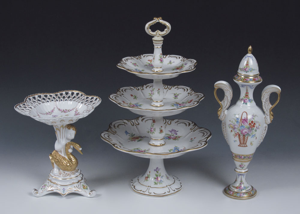 3 PIECE HAND PAINTED PORCELAIN: By Alfredo Toledano Escudero. 1) Bavarian porcelain three tier dessert stand, 16.5'' tall, 10'' dia. at the widest. 2) French Limoges swan handle covered urn, 14.5'' tall. 3) Reticulated compote supported by a cherub with gilt swan, 8 1/2''h. x 8'' dia.