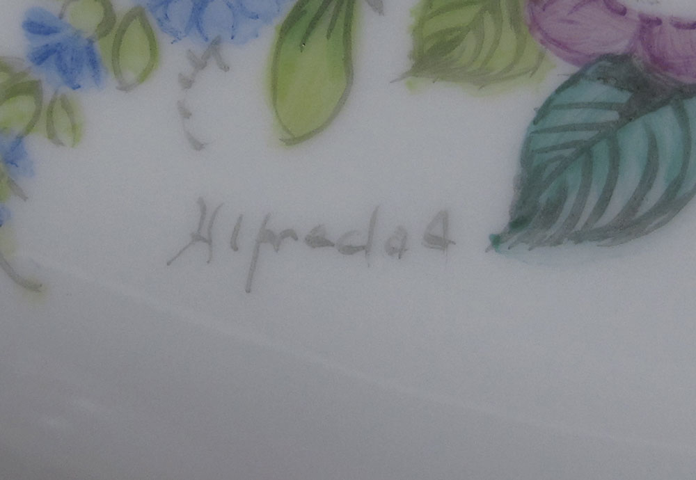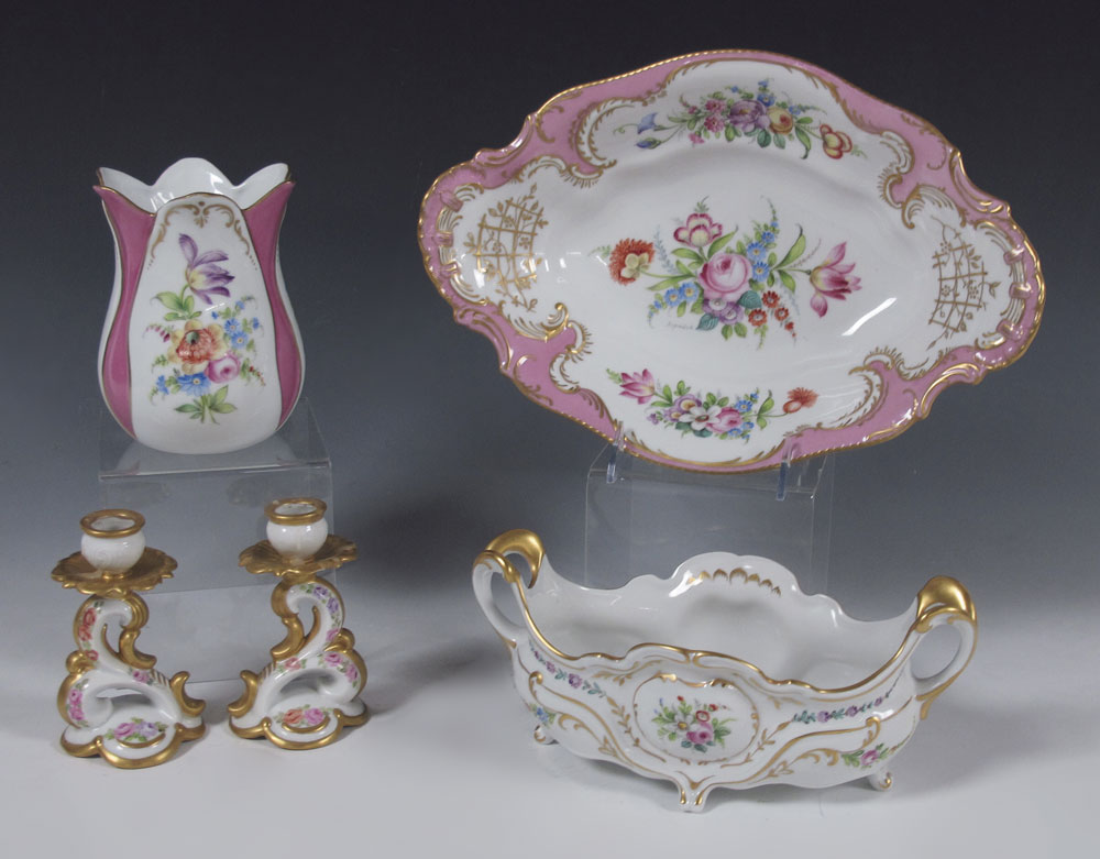 5 PIECE HAND PAINTED PORCELAIN: Signed ''Alfredo'', Alfredo Toledano Escudero. Painted in the Dresden manner, Rosenthal oblong center bowl, 13 1/2''l., Limoges footed center bowl, 10 .5''l., a Limoges 6'' vase, and a pair of 5'' candlesticks.