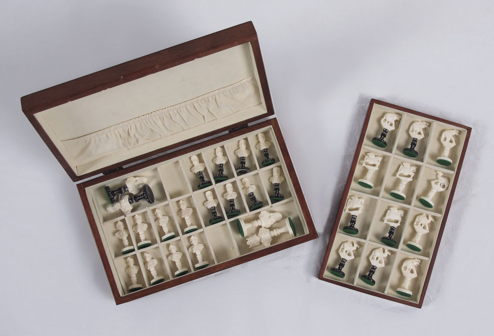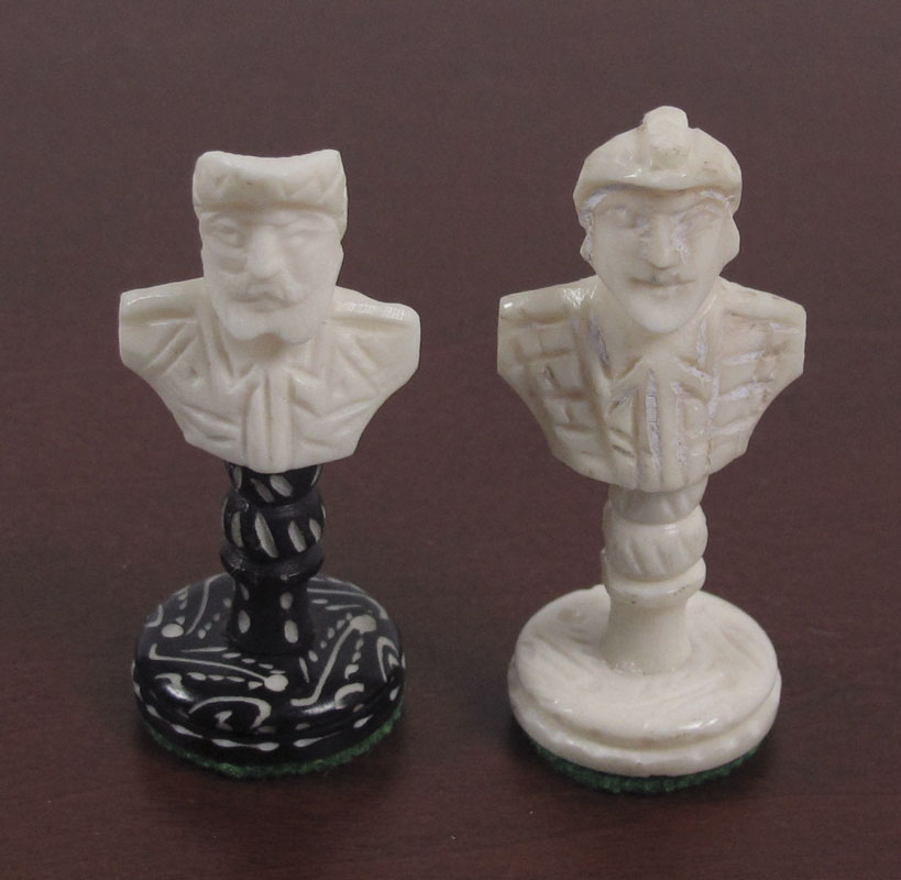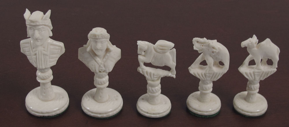 CARVED IVORY CHESS SET: Carved with royalty King and queen, elephant castles, camel rooks, winged horses knights and royalty pawns. King measures 3'' h.. Sold with wood presentation case 3'' x 12 1/4'' x 7 1/2''.