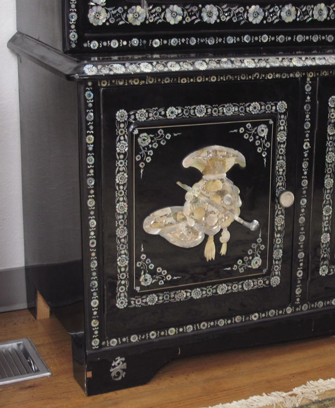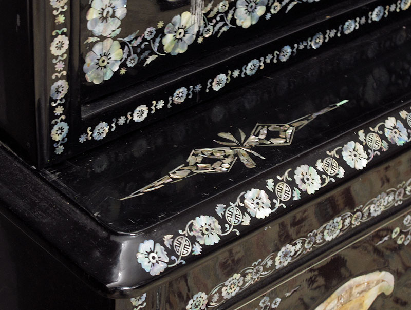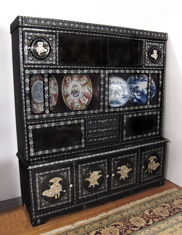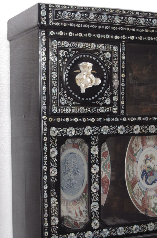 CHINESE MOTHER OF PEARL INLAID DISPLAY CABINET: Black lacquer with ornate mother of pearl floral inlay and painted leaf designs. 2 doors over 2 sliding glass doors over 4 doors with stone inlay panels. 76 3/4'' h. x 72'' x 19''.