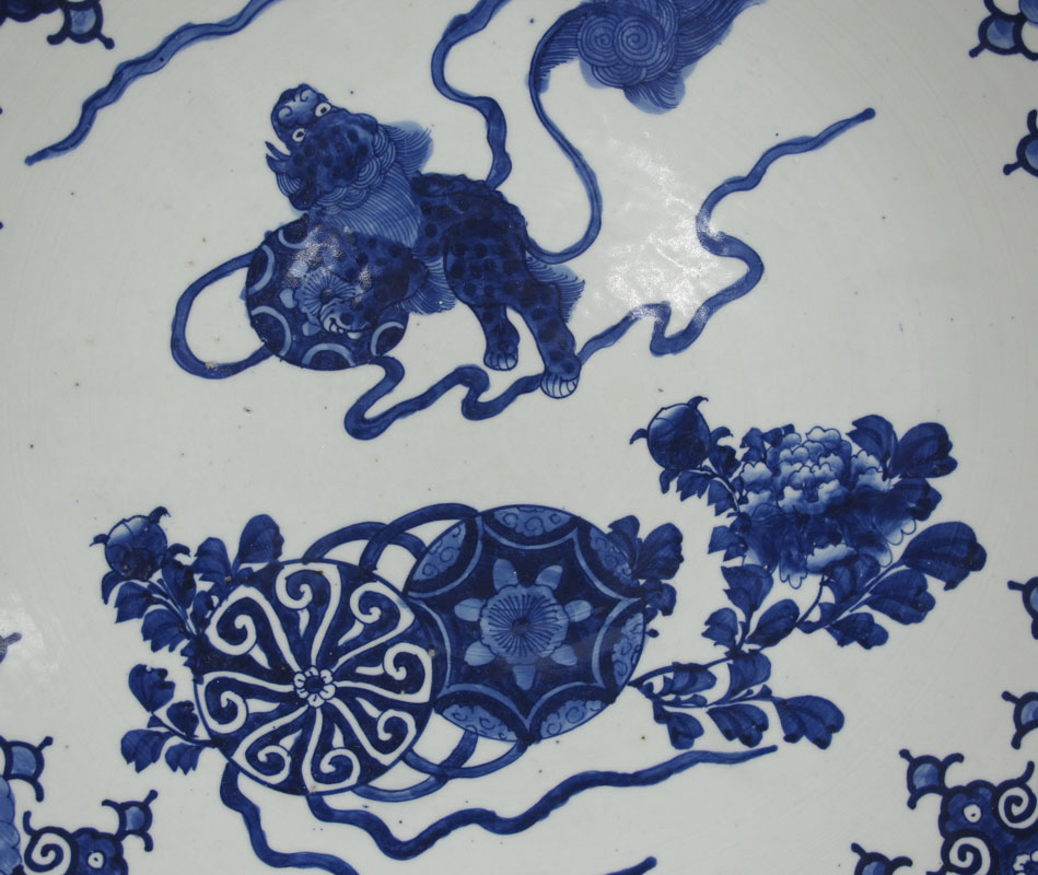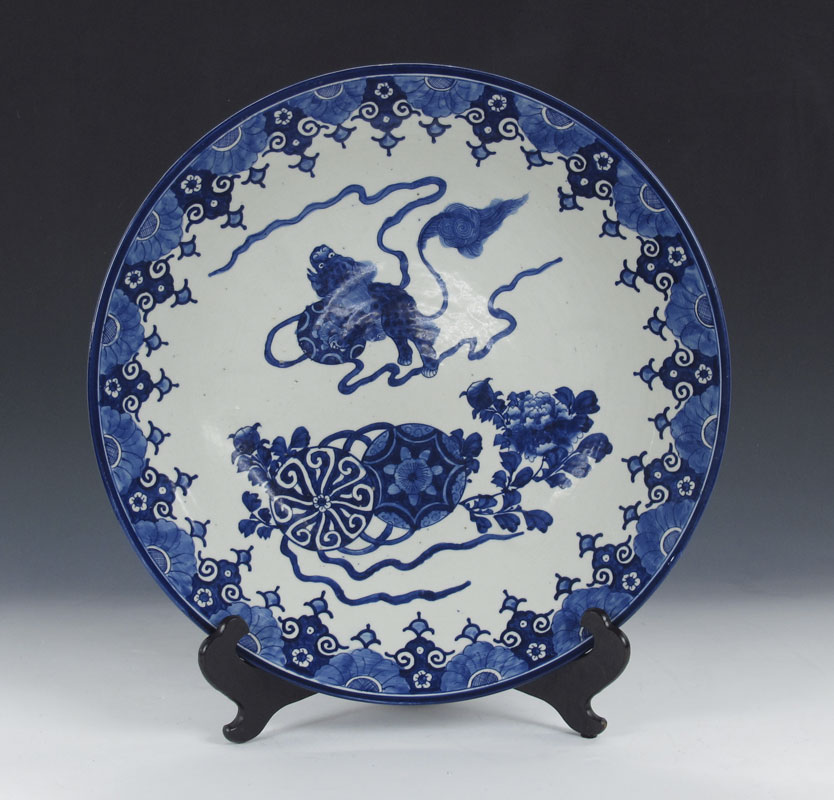 LARGE JAPANESE BLUE DECORATED CHARGER: 19.5'' dia. Accompanied by a letter stating this plate is 250 years ago, dated 1963.