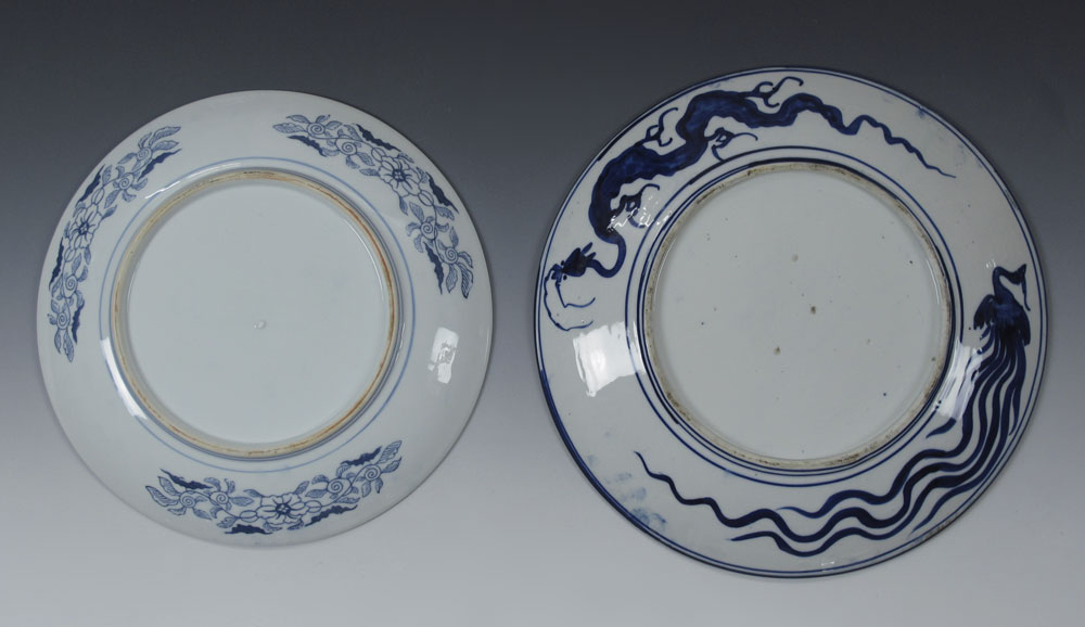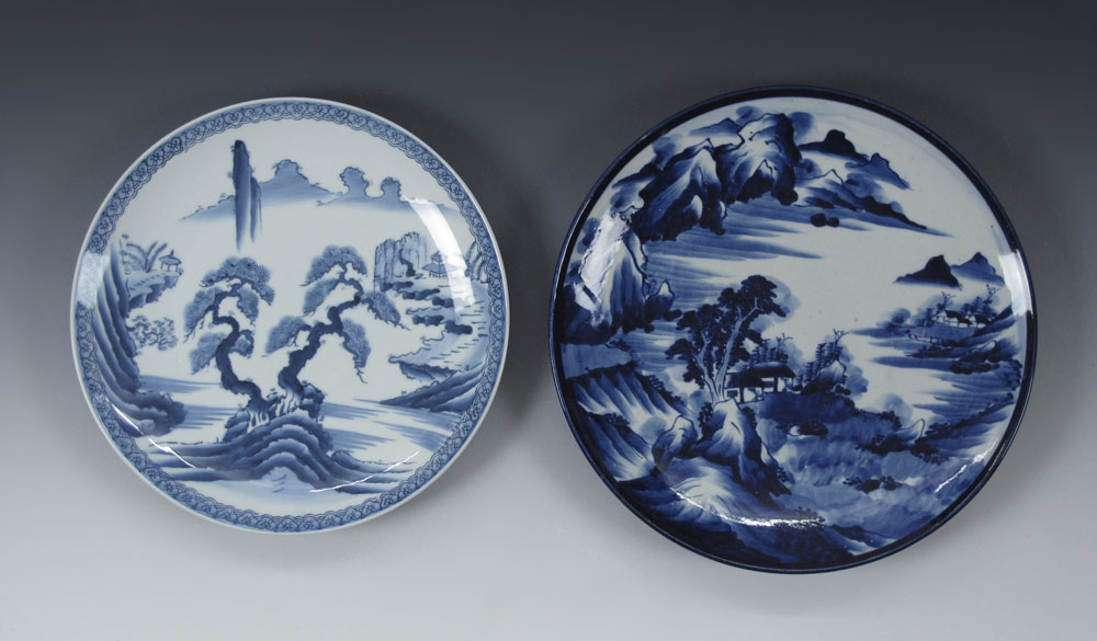 TWO LATE 19TH C ARITA WARE CHARGERS: Blue and white scenic landscapes. 16'' and 14.5'' dia. Unsigned.