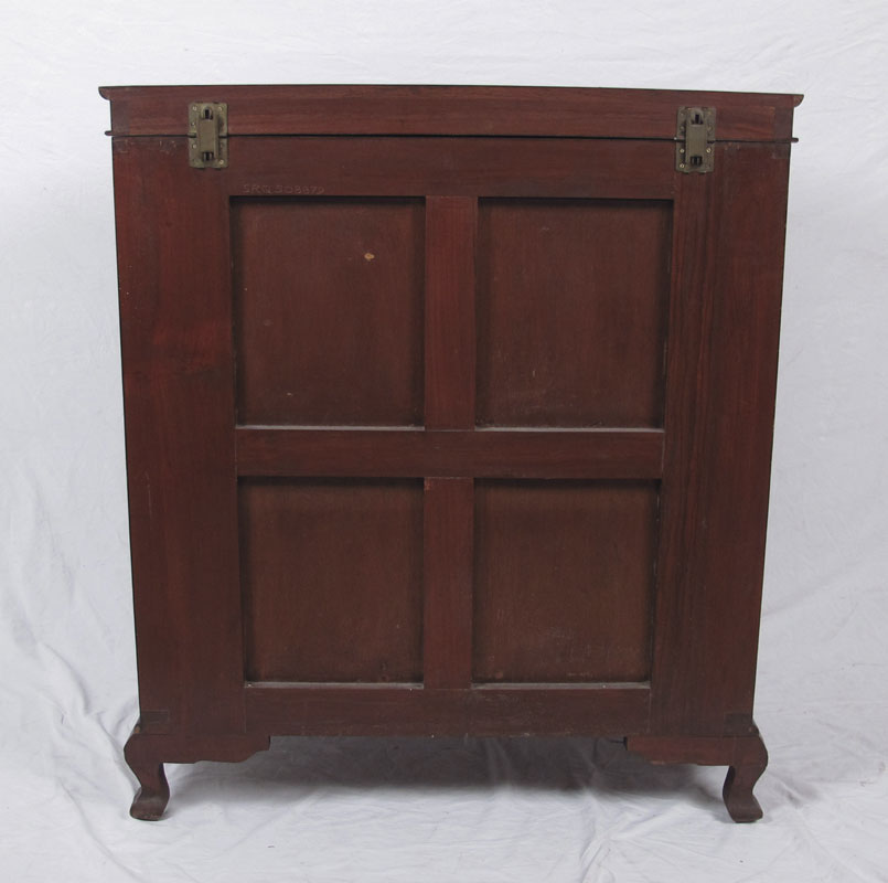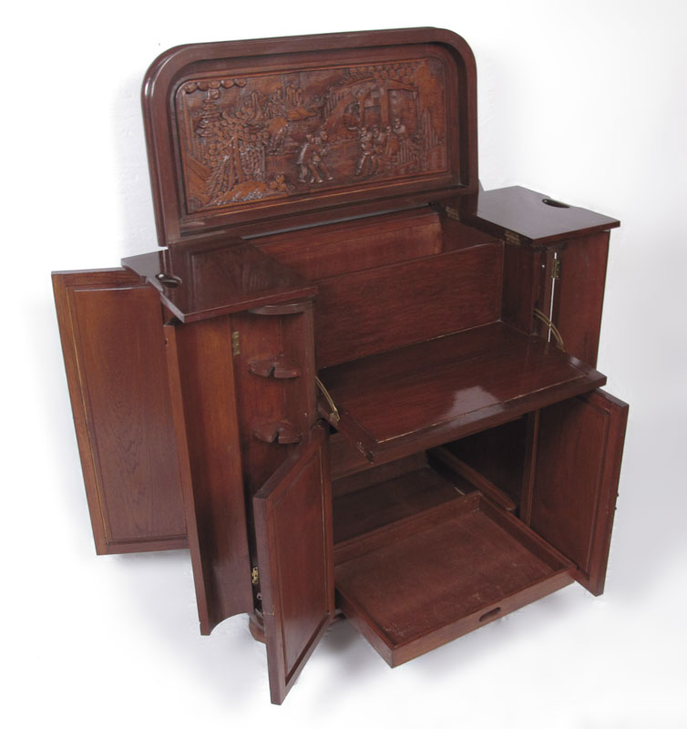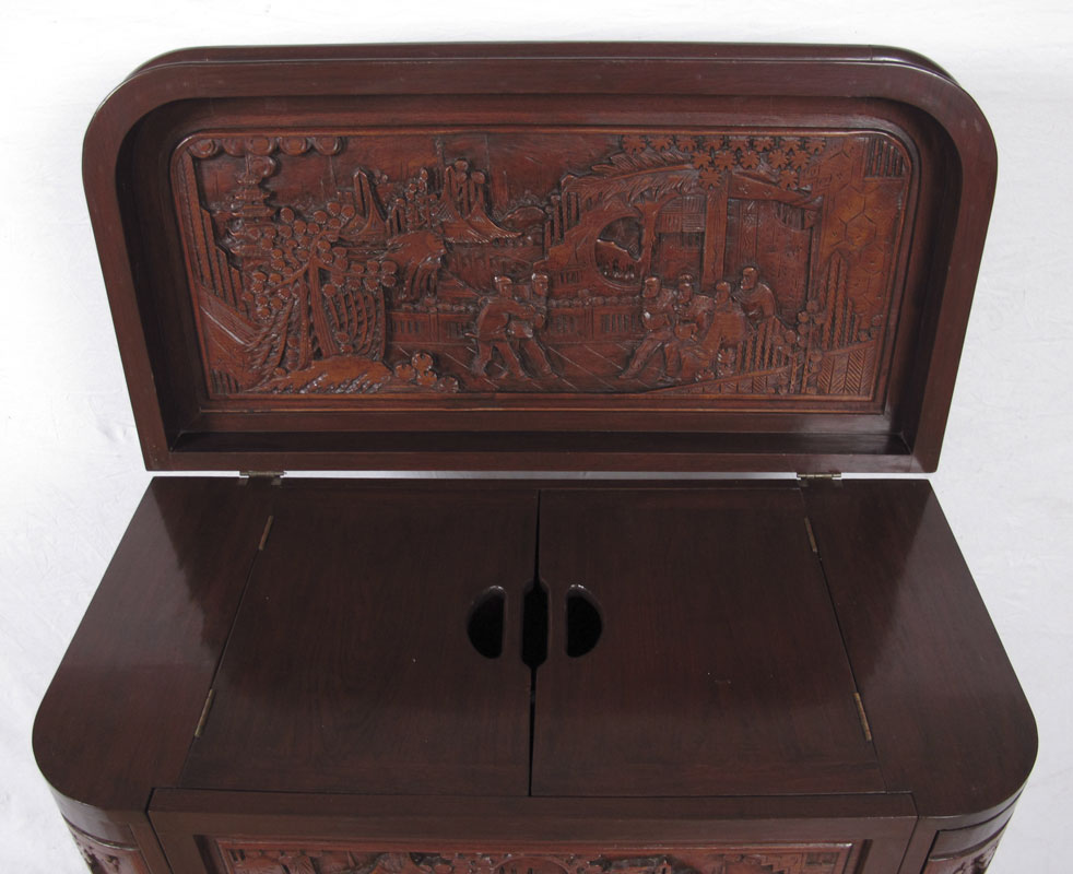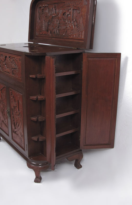 CARVED ORIENTAL LIFT TOP BAR: Carved front and sides with genre scenes, top lifts to reveal sliding surface over bottle storage, lower doors in front with pull out tray, front corner doors open to stemware storage, side doors reveal shelves. 41 3/4''h. x 36''w. x 18''d.