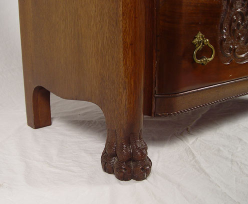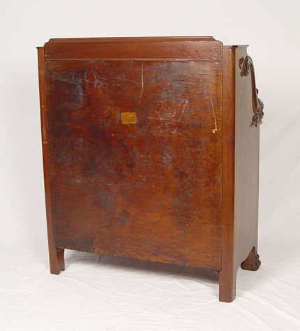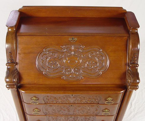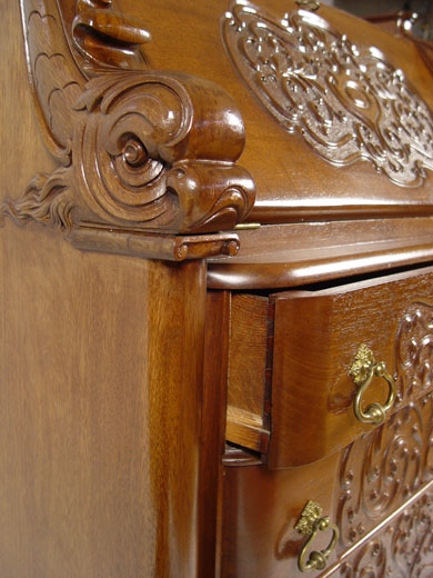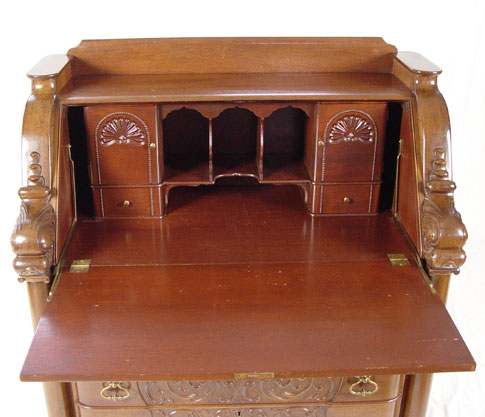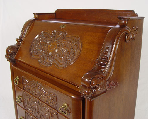 HORNER QUALITY DROP FRONT DESK WITH FIGURAL DOLPHIN STILES: Carved mahogany, compartmented interior over four drawers, Approx. 43'' x 37 1/4'' x 19 1/2''.