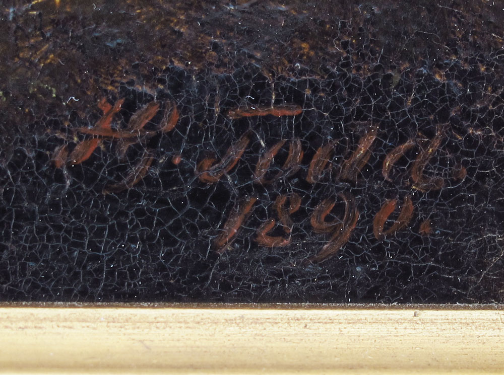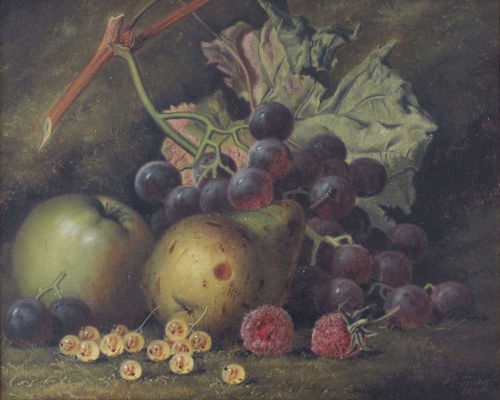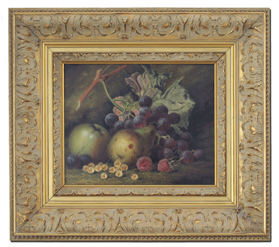 TODD, Henry George, (British, 1846-1898): Still Life of Grapes, Apples, and Berries, Oil/Canvas, 8'' x 10, signed and dated 1890, fine contemporary frame 14 1/2 x 16 1/2'', William Rivett gallery label verso.