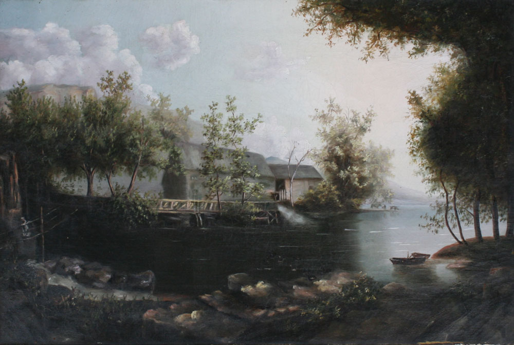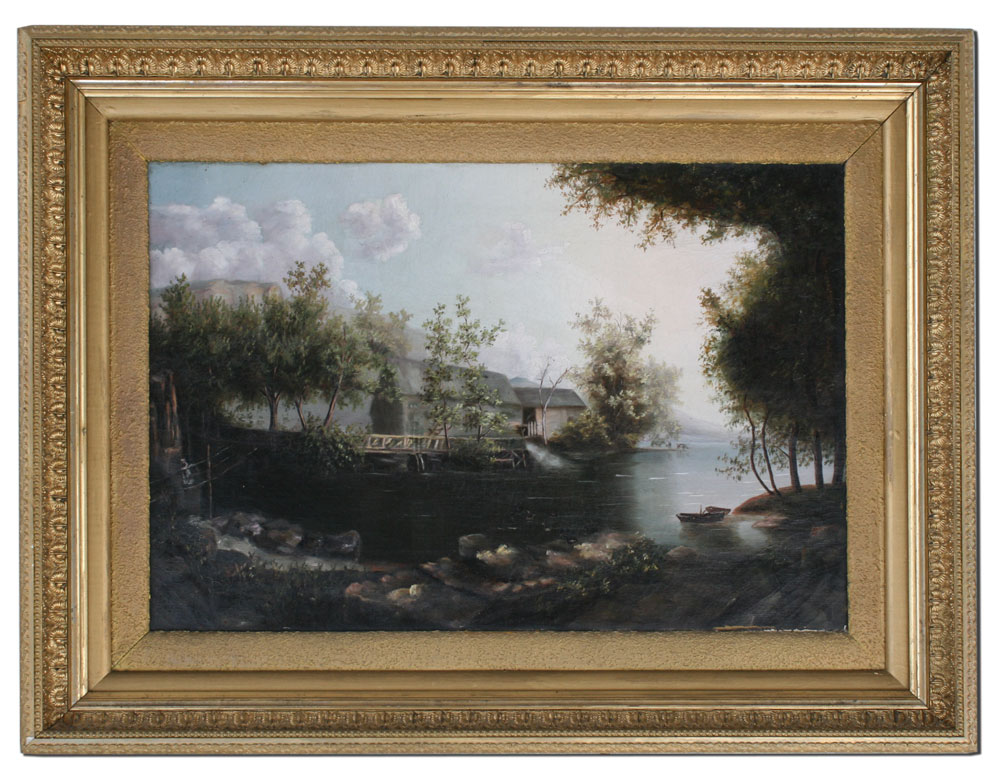 19TH CENTURY RIVER LANDSCAPE: Oil/Canvas, 16'' x 24'', no visible signature, period gilded frame with wear and overpaint, 24'' x 32''.
