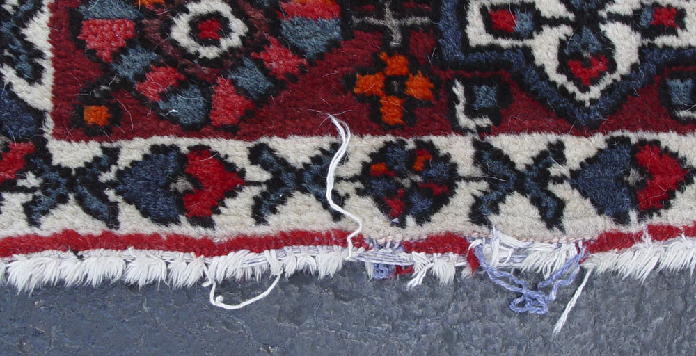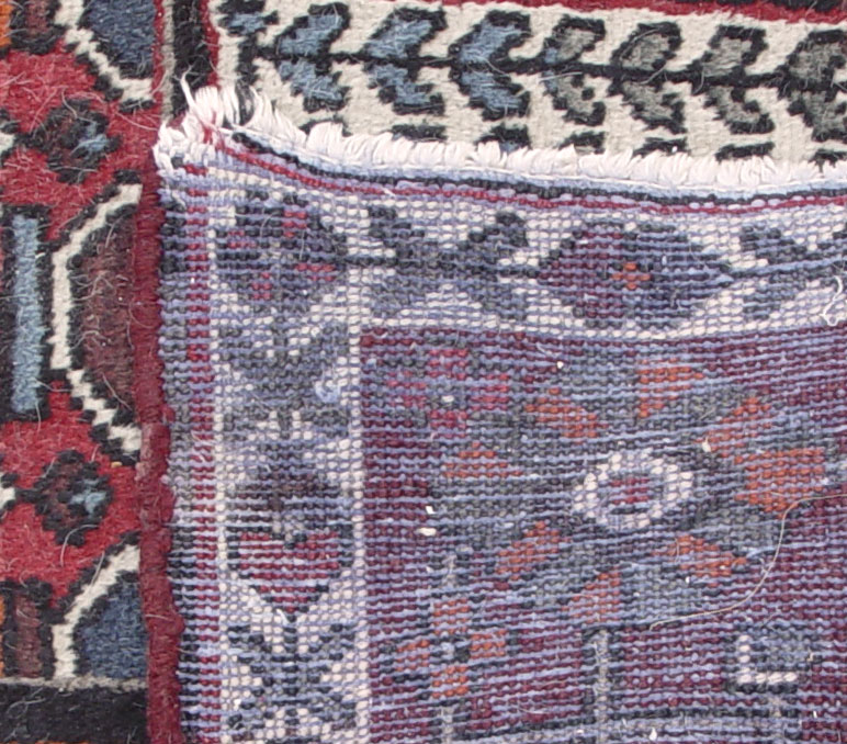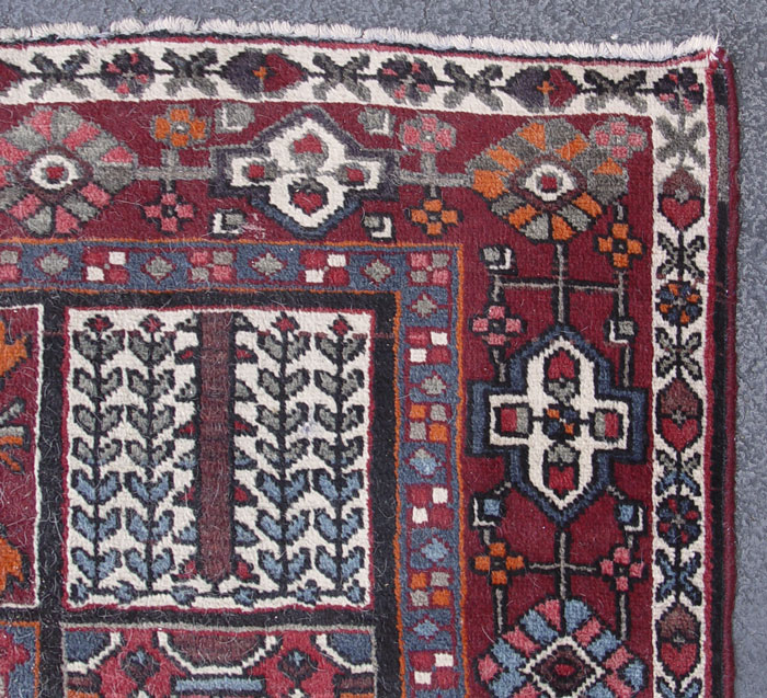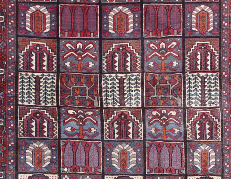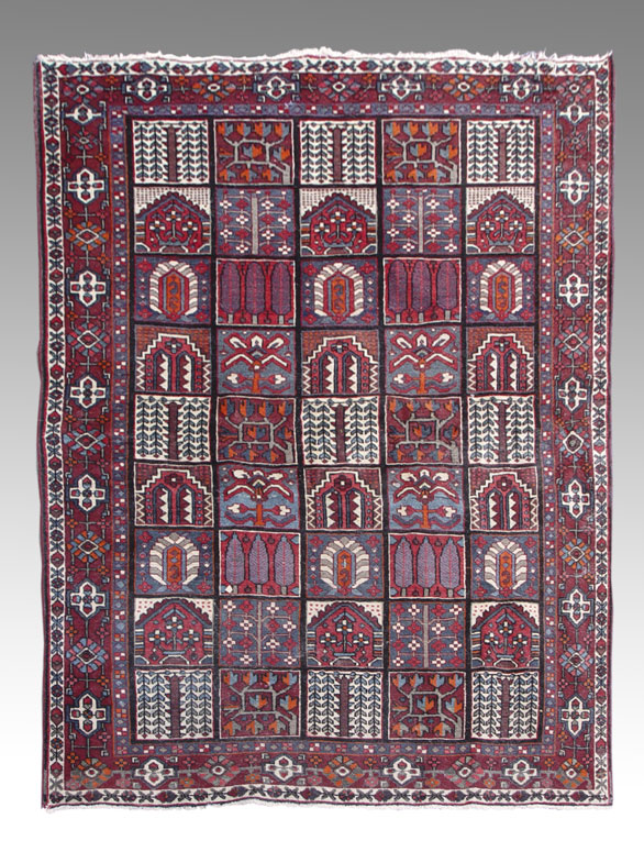 MODERN PERSIAN BACHTIARI HAND KNOTTED WOOL RUG, 6' 9'' x 9' 10'': This brightly colored rug has a traditional stylized garden panel. The patterns in each panel represent different trees or flowers and the dividing lines are the irrigation streams. A lush garden is a symbol of prosperity in an arid part of the world. The reds, blues, oranges, and whites used in this rug make for a colorful garden that would go with many different decorating styles. This is a coarsely woven rug in good condition.