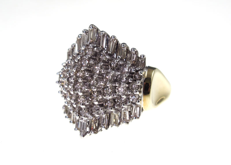 3.5 CT DIAMOND CHEVRON RING: 14K yellow gold ring contains thirty eight round full cut diamonds and twenty two baguette cut diamonds. Weight: 3.50 Ct. Approx. The diamonds average SI-I1 in clarity and H-I-J in color. The diamonds are prong set. Weight: 11.4 grams. Size:7.5