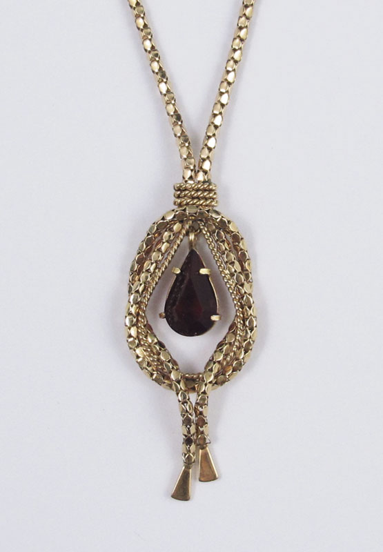 18K NECKLACE WITH RED STONE: 18K yellow gold necklace with fancy tabbed rope bolo style design. Pear shaped synthetic red stone in center. Spring ring clasp, 22''l. Weight: 11.9 grams.
