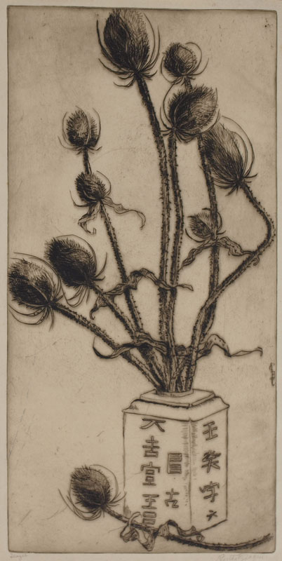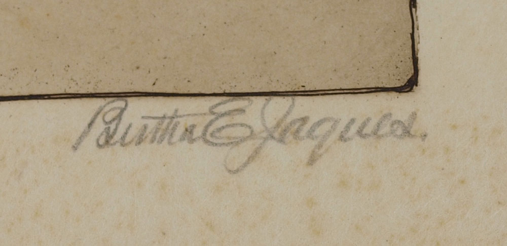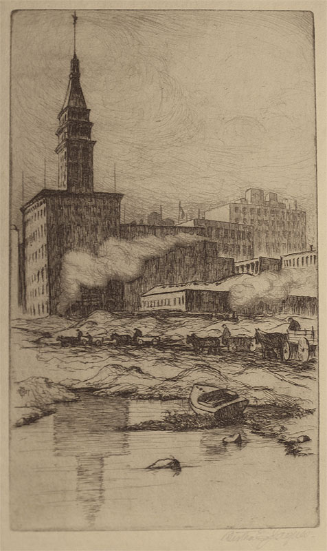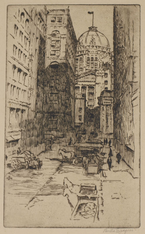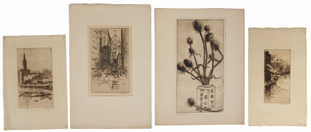 JACQUES, Bertha, (American, 1863-1941): 4 PIECE ETCHING LOT TO INCLUDE: 1) ''Lake Front Dump'', on Japon paper, 14 1/2'' x 9 3/4'', pencil signed in margin, unframed. CONDITION: Scattered spots of foxing with glue residue in all 4 corners; 2) City Scene from the River'', 15 1/2'' x 9'' with margins, pencil signed lower right, monogrammed in the plate and dated 1901, unframed. CONDITION: Scattered pale foxing throughout; 3) ''Federal Building from Quincy Street'', 16'' x 10 1/4'' with margins, pencil signed lower right, indicated lower left last state. CONDITION: Glue marks visible in corners and mid margin, glued down at those points, minor crease in right mid margin, pale foxing; 4) ''Teazee'', 16 «'' x 10'', pencil signed lower right, titled lower left, indicated lower left corner added ? to jar. CONDITION: Taped down to folder in margins, faint staining in upper right margin from tape. Sold as is.