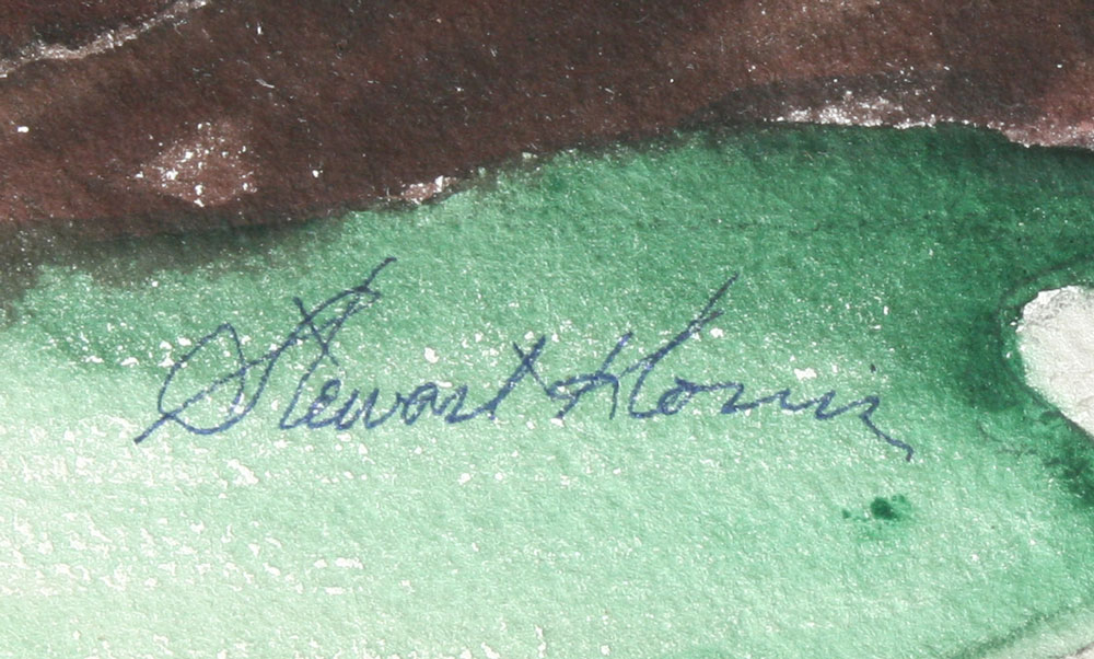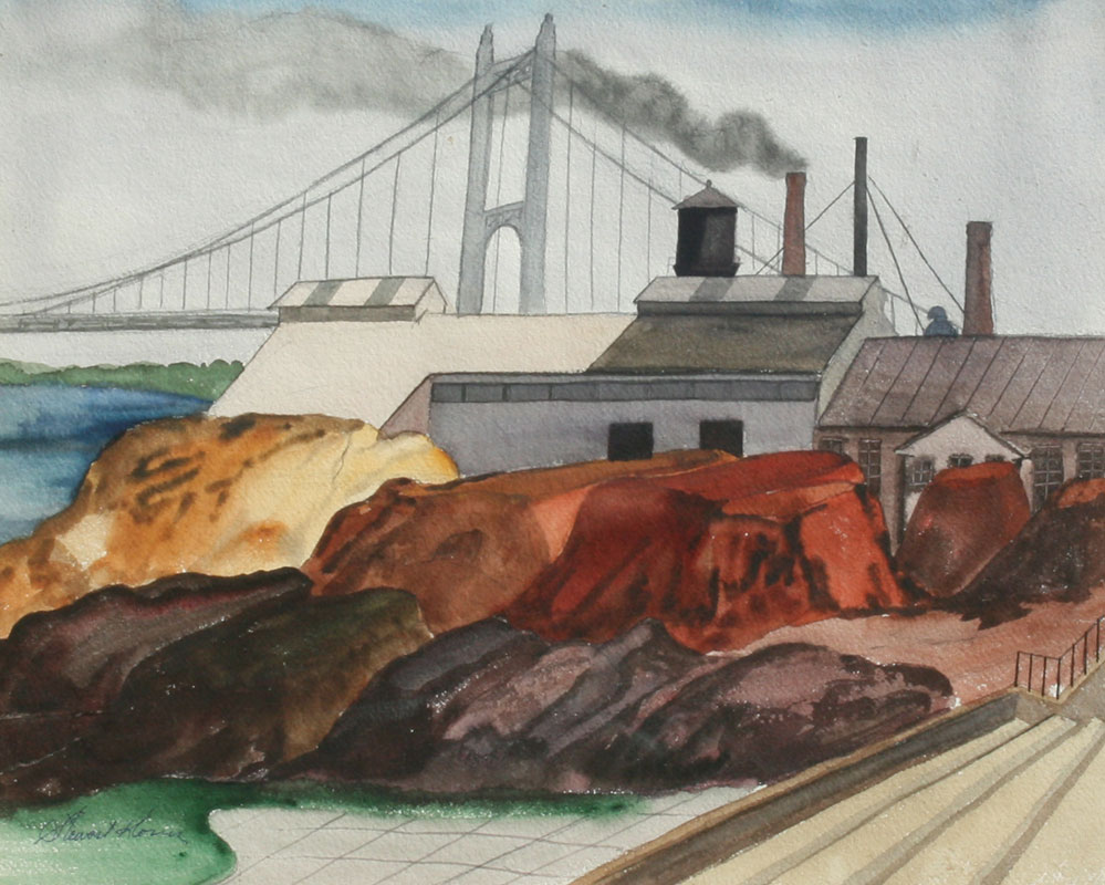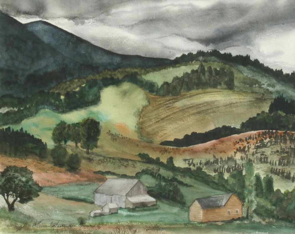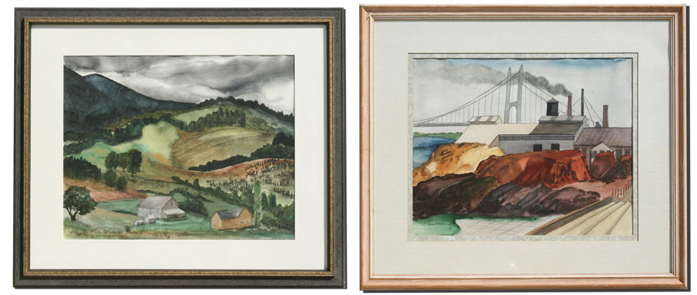 KLONIS, Stewart, (American, 1901-): 2 LANDSCAPES: 1) Suspension Bridge with Factory, Watercolor, sight size, 16'' x 20'', signed lower left framed, 27'' x 31''; 2) Rural Valley Landscape with Country House and Barn, Watercolor, sight size 16'' x 20'', signed, framed, 24'' x 29''.