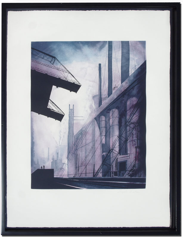 EARLE, Eyvind, (American, 1916-): ''Factory'', Aquatint, 41 1/2'' x 29'', pencil signed lower right, numbered 173/195 lower left, Pascal Giraudon blind stamp lower left, custom framing, 45'' x 32''.
