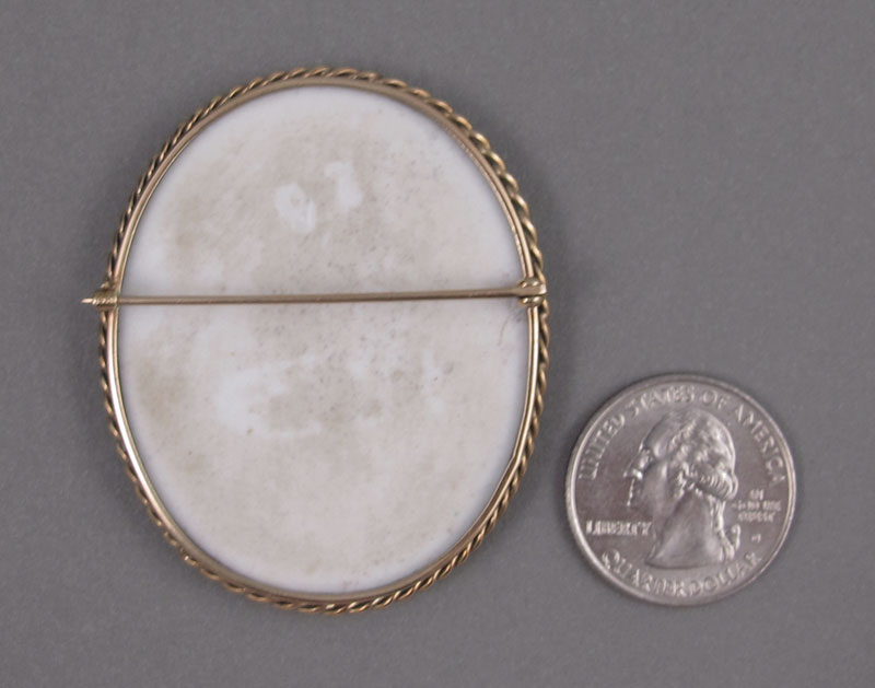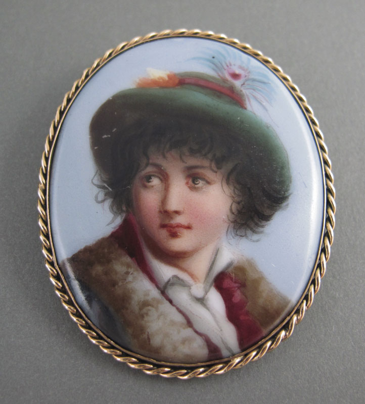HAND PAINTED PORCELAIN PORTRAIT BROOCH: 14k yellow gold twisted rope frame, 2 1/4'' x 1 3/4''.