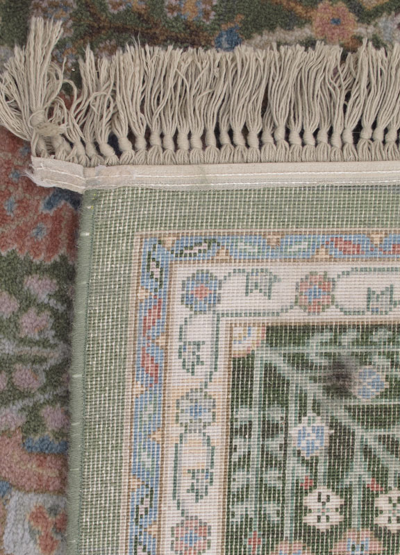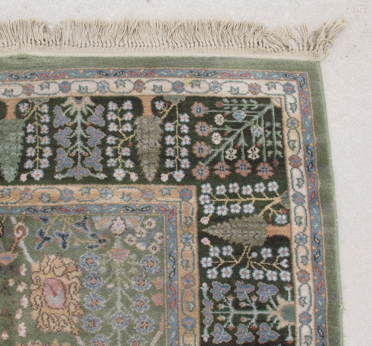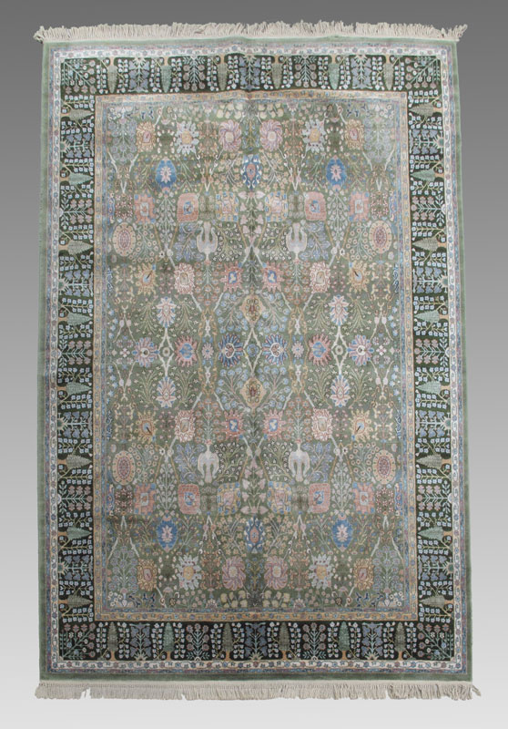 MODERN AMERICAN KARASTAN MACHINE WOVEN WOOL RUG, 8'8'' x 12': This pretty, mostly green rug has a traditional Persian garden design done in non traditional colors. The large flower heads and palmettes that are joined by vines and leaves are executed in soft colors that would be easy to decorate with. The border of navy blue with alternating Cypress trees and sprays of flowers completes the picture. Condition is very good. This rug originally cost over $2000!