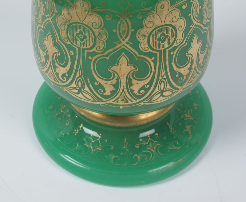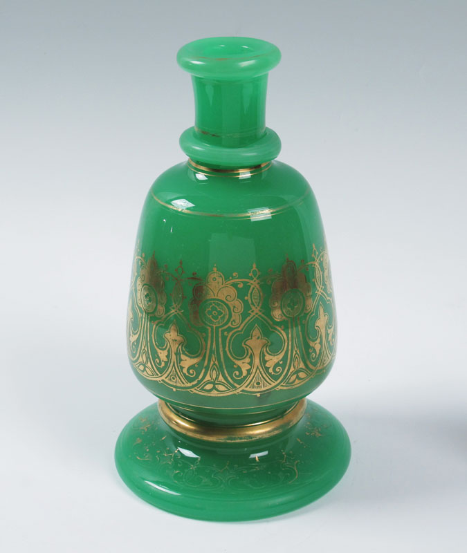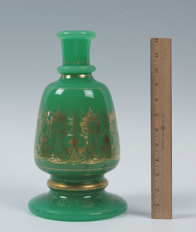 EARLY BOHEMIAN OPALINE BOTTLE VASE: Gilt decorated green opaline, 13'' .