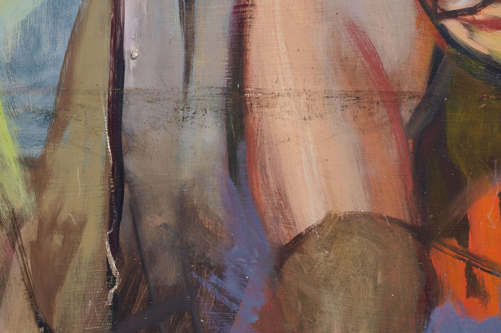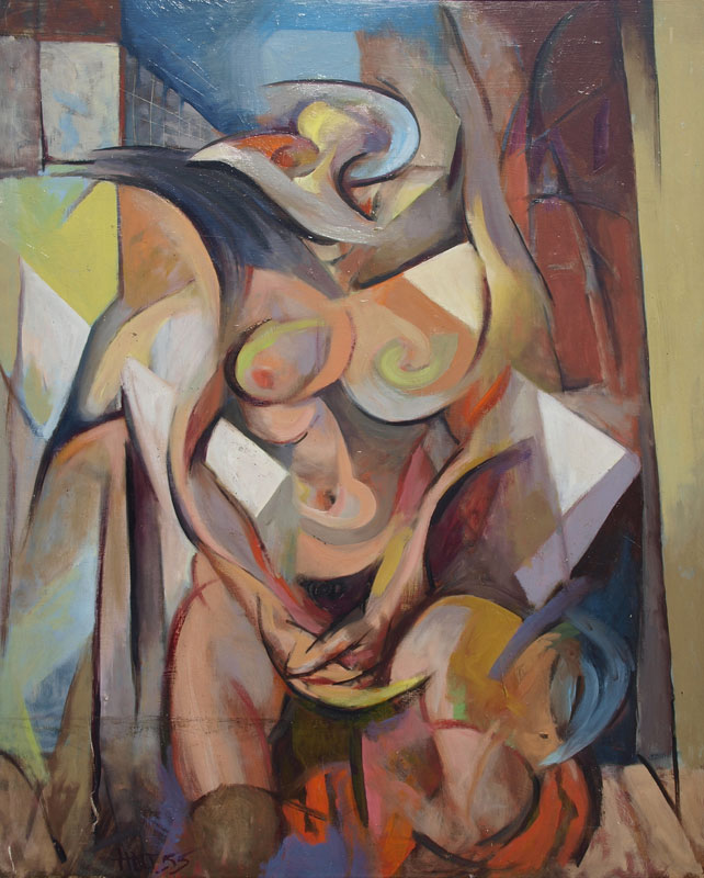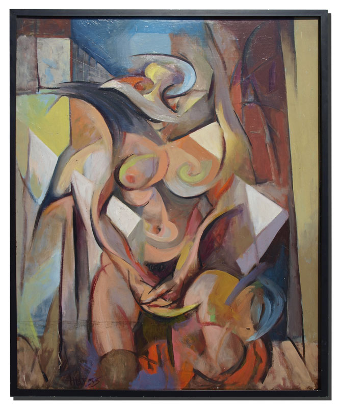 LARGE ABSTRACT/CUBIST FEMALE NUDE OIL/MASONITE SIGNED HOLT: 48'' x 36'', signed lower left, dated 55, black painted frame with wear, 49'' x 38''.