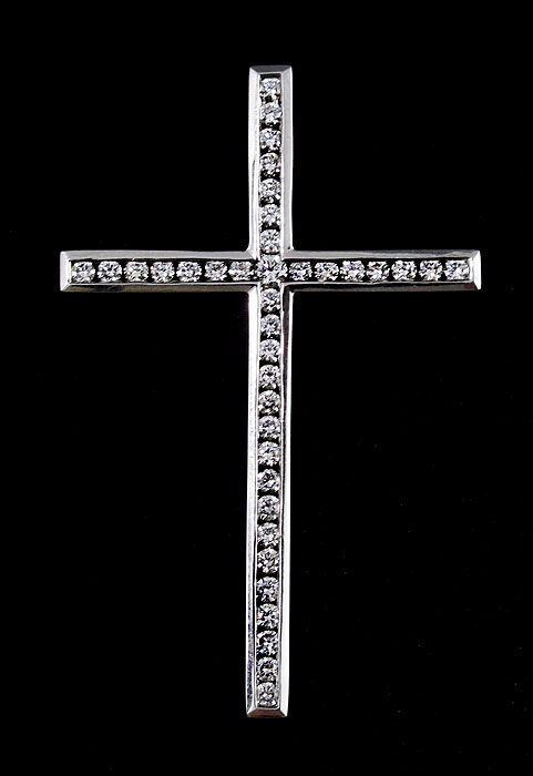 18K 1.00 CTW DIAMOND CROSS PENDANT: 18K white gold cross pendant contains thirty eight round brilliant cut diamonds. Weight: 1.00 Ct. Approx. Rated VS in clarity and G-H in color. The diamonds are channel set. Length 2''. Weight: 4.9 grams.