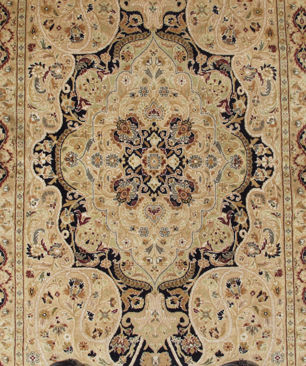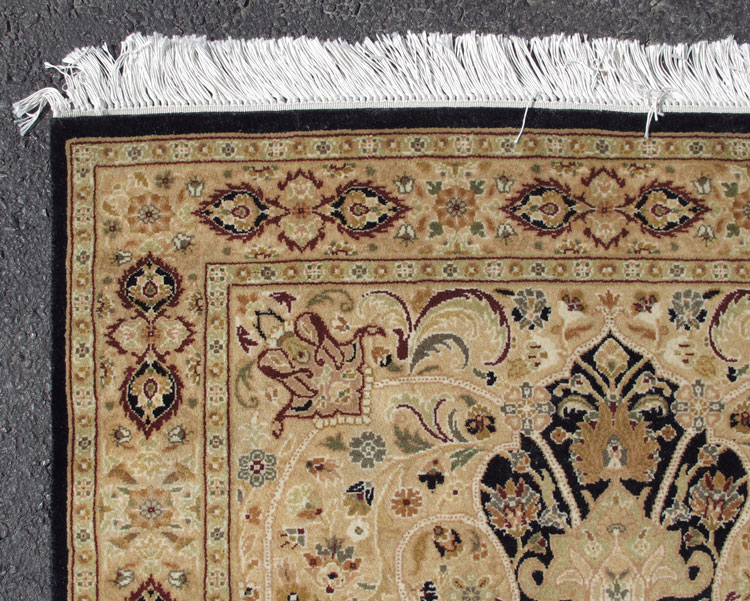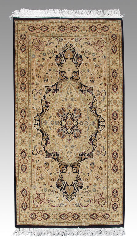MODERN SINO PERSIAN HAND KNOTTED WOOL RUG, 3' 2'' x 5' 4'': A very soft colored rug with just a few accents of deeper colors of black and burgundy that make the design really stand out. The overall impression of the rug is of the beiges, greens and golds in a tracery pattern of flowers and leaves. Condition is very good.