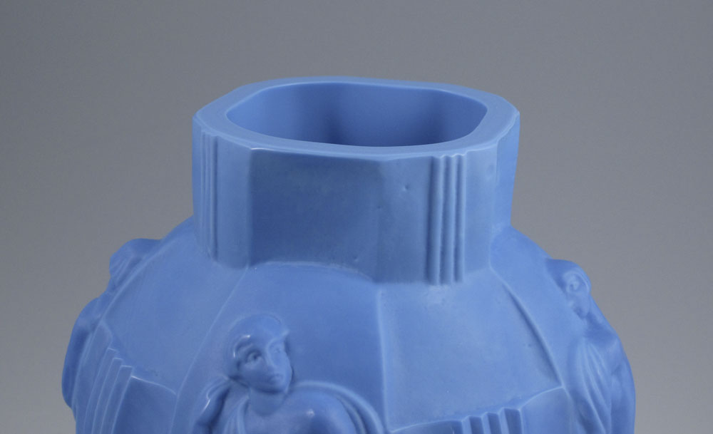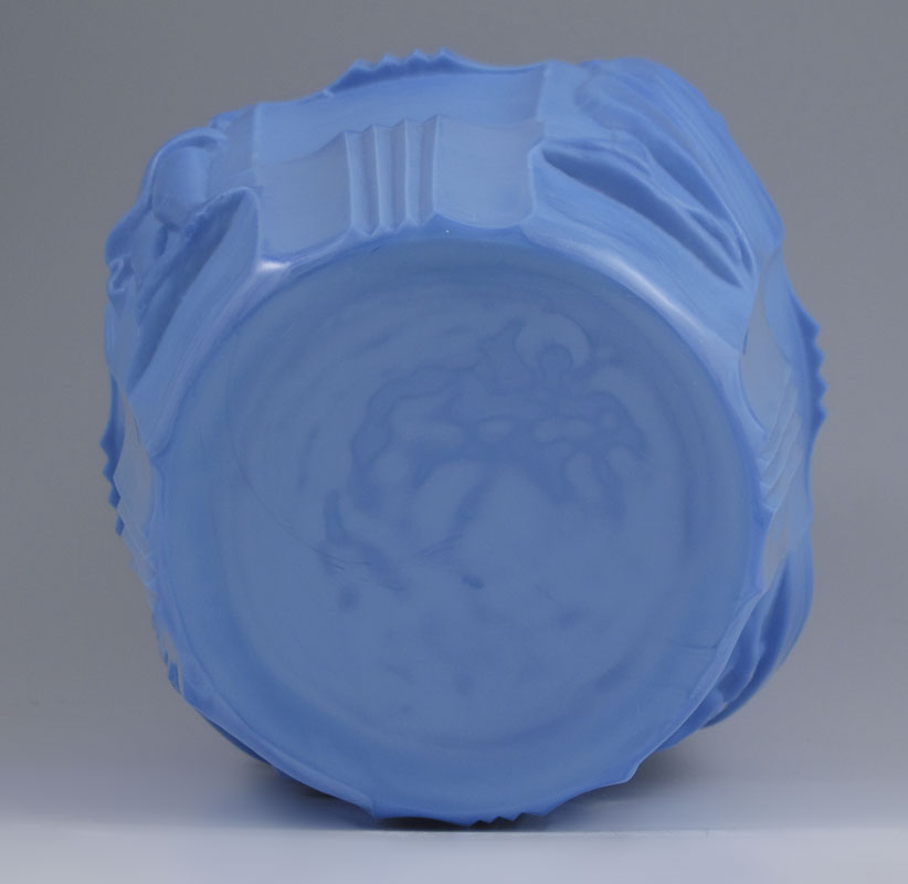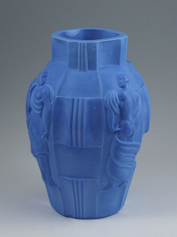 CURT SCHLEVOGT CZECH ART GLASS ''INGRID'' VASE: Mold cast lapis glass showing four panels of woman in various stages of dress and dance, 9 1/2''.