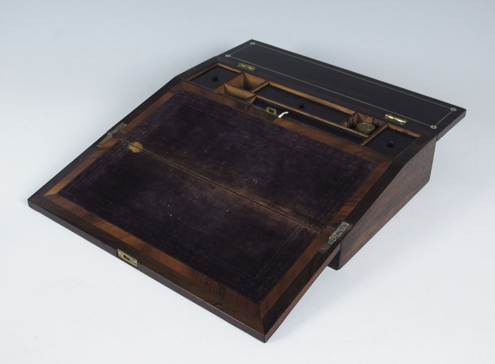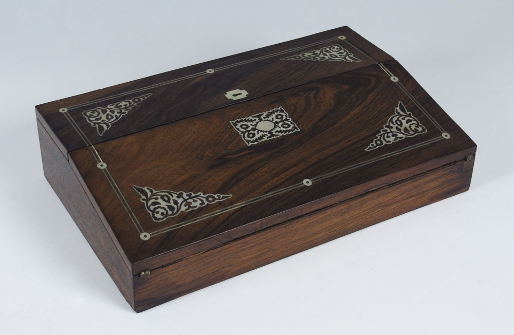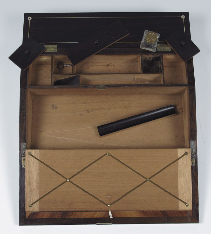 VICTORIAN MOTHER OF PEAL INLAY TRAVEL DESK: String and floral mother of pearl inlaid case with purple velvet writing surface, compartmented cubby holes. Key lock still functions. 3 3/4'' h. x 16'' x 10''.