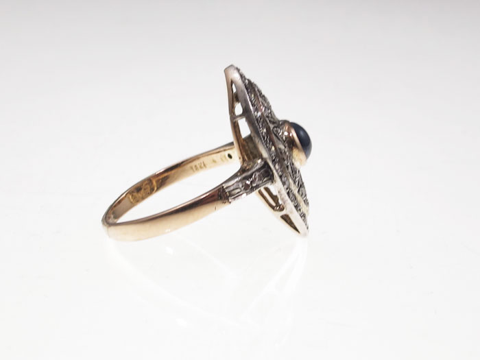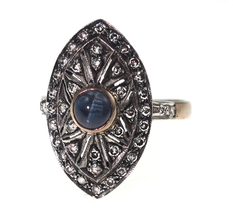 18K SAPPHIRE & DIAMOND RING: 18K yellow gold ring contains thirty eight round single cut diamonds. Weight: .38 Ct. Approx Rated VS-SI in clarity and Light Brown in color. At the center is a round shaped cabochon cut sapphire. Weight: .25 Ct. Approx. The diamonds are prong set. The sapphire is bezel set. Weight: 4.0 grams. Size: 7.5.