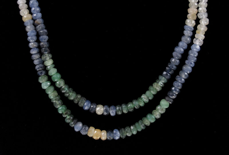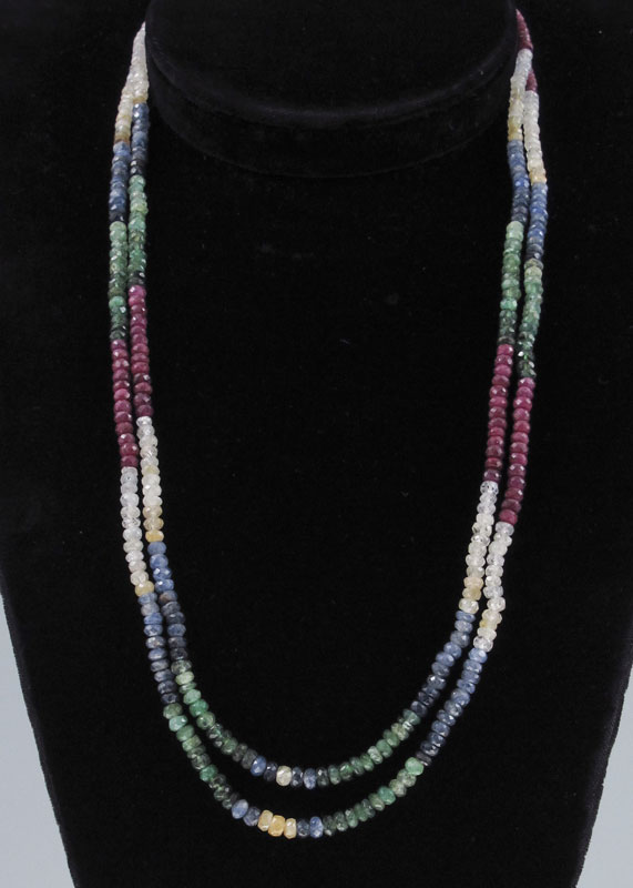 GEMSTONE BEAD NECKLACE: 20'' Two strand necklace with 3.50 mm faceted rondelles shaped gemstone beads including green beryl, sapphire, ruby and quartz. Sterling clasp. Approx. 19''l. Approx. 125.00 Cts.