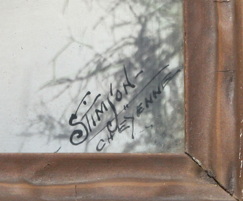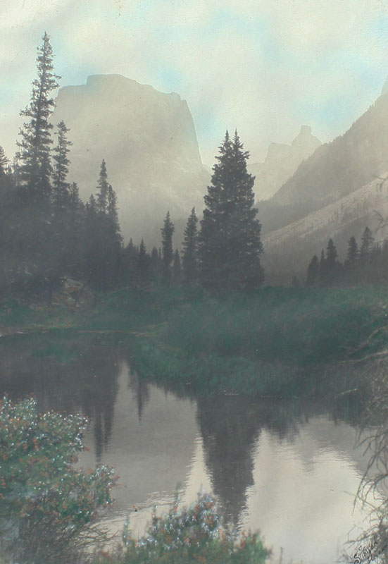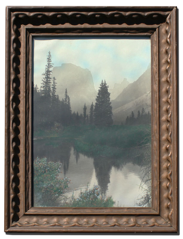 STIMSON, Joseph, (American, 1870-1952): Western Landscape with River and Mountains, probably Yosemite, Hand Tinted Photo, 17 1/2'' x 12 3/4'', signed lower right ''Stimson/Cheyenne'', period gilded gesso frame, 22 1/2'' x 17 1/2''. In 1900, Stimson was hired as a publicity photographer for the Union Pacific Railroad. The railroad needed photographs to help change the image of the scandal-plagued railroad and Stimson was given free rein to photograph anything that might draw investors to the railway. Besides the obvious subject of the railroad itself, Stimson was to photograph natural wonders, city scenes, farms and ranches, mining and irrigation projects, and anything else that might bring money to the new railroad. In 1903 Stimson's reputation as a scenic photographer had grown to the point that he was asked by the state of Wyoming to provide one hundred eighty-two hand colored Wyoming scenes that would be displayed at the Louisiana Purchase Exposition to be held the following year in St. Louis. He was awarded a silver medal for his views of mining and machinery, and two more silver medals for two other displays. By 1906, after only ten years in scenic work, Stimson had gained national recognition as a photographer and artist. Stimson died in 1952 at the age of 82 and is buried in Cheyenne. (Wyoming State Archives Website)