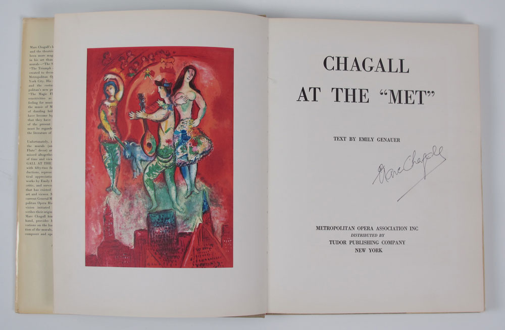 CHAGALL, Marc, (Russian, 1887-1985): Signed copy of ''Die Zauberfloten, At The Met'' Mozart Metropolitan Opera Book. Spurious Chagall signature title page. Published by Tudor Publishing Company, 1971. Crisp pages, appears complete. 1 1/4'' h. x 14 1/4'' x 11''.