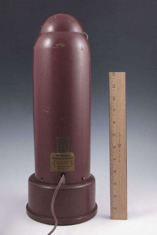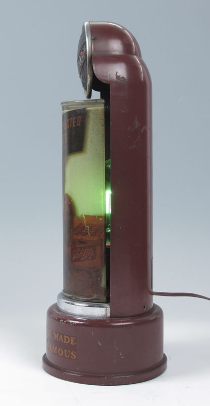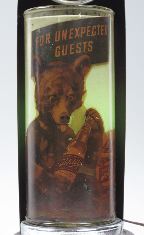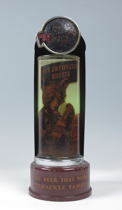 EARLY SCHLITZ BEER ADVERTISING BAR TOP DISPLAY: Bar top or bar back display lighted advertising sign for Schlitz beer. Metal body with Schlitz world emblem on top, original ''THE BEER THAT MADE MILWAUKEE FAMOUS'' decal on base, original decals on back. Applied decal on front of glass with bear and beer bottles and slogan ''FOR UNEXPECTED GUESTS''. Green bulb, currently lights up but cannot guarantee to continue. 17 1/4'' x 6'' dia.